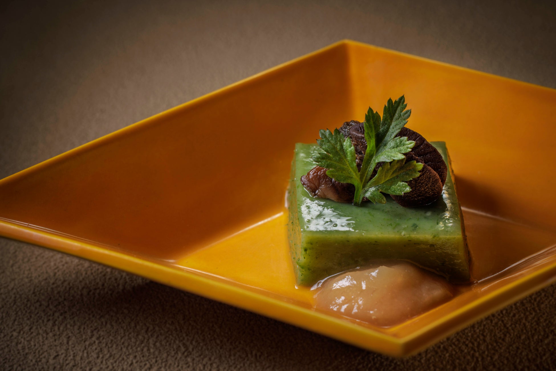 和のハーブである蓬を豆富に仕立て、エスカルゴのしぐれ煮、焼き新玉葱のピュレを合わせた一品です。蓬の香りと柔らかく炊き上げたエスカルゴの旨味を、新玉葱が持つ柔らかな甘みが調和させます。春らしい王道な日本料理の中に、フランス料理の発想から食材を組み合わせた遊び心が詰まっています。