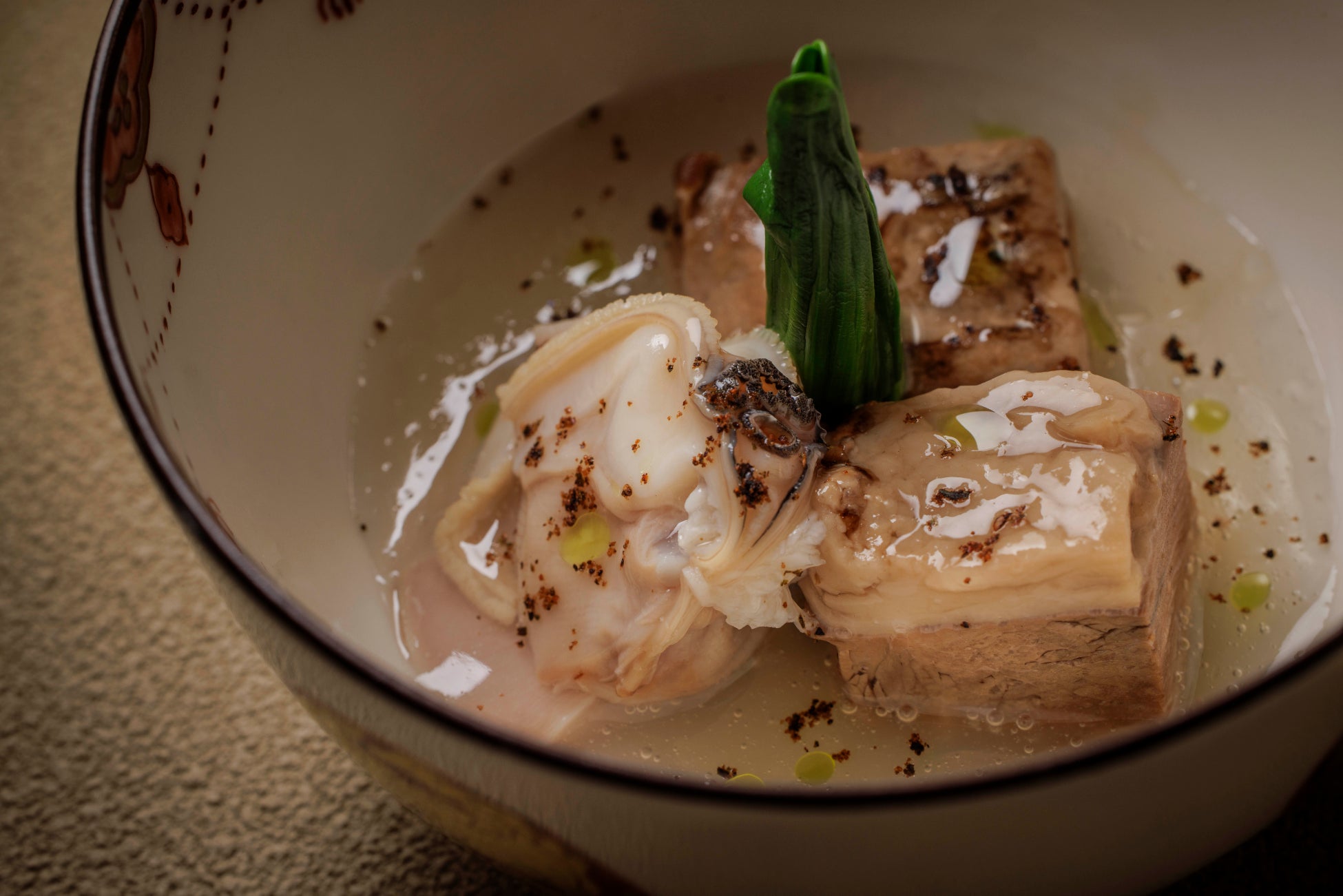 春に旬を迎える山と海の食材を出合いものとして組み合わせた温かい一品です。子羊は、日本料理の技法で臭みを丁寧に取り除き、柔らかな質感に仕立てました。蛤の出汁に春の山菜である行者大蒜の香りを重ねることで、双方の素材を調和させ、互いの旨味を引き立てています。伝統を重んじながらも自由な発想で美味しさを追求する、まさに真味自在を体現した料理です。