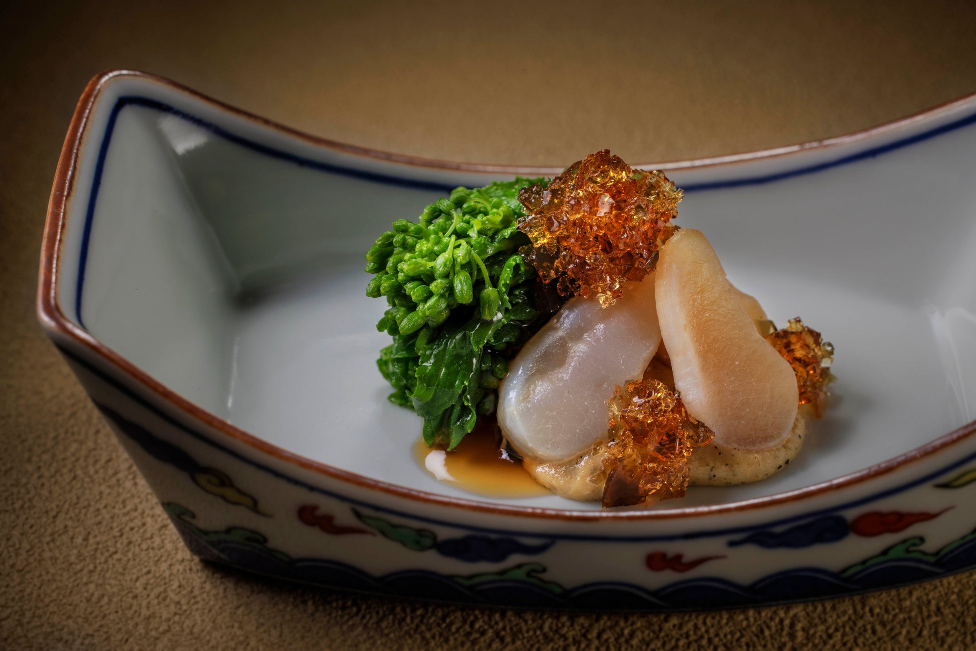 春に旬を迎える真珠貝と菜の花に、中国の伝統食材であるピータンを合わせました。濃厚なコクを持つピータンの卵黄は黄身酢に、琥珀色の卵白は土佐酢をまとわせ、細かく刻むことで美しく仕上げました。素材の取り合わせに工夫を凝らしつつ、日本料理としての調和を追求した一品です。
