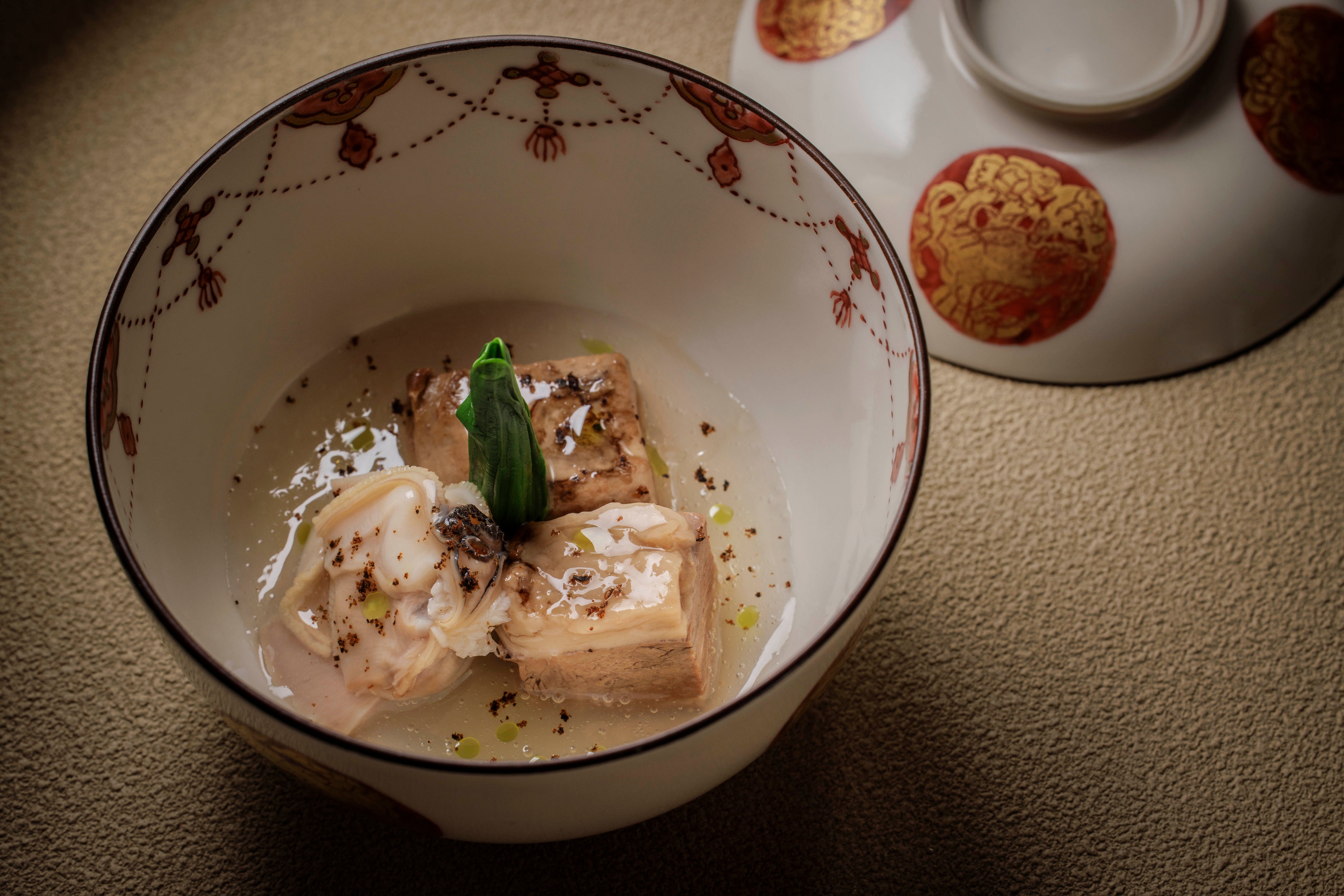 春に旬を迎える山と海の食材を出合いものとして組み合わせた温かい一品です。子羊は、日本料理の技法で臭みを丁寧に取り除き、柔らかな質感に仕立てました。蛤の出汁に春の山菜である行者大蒜の香りを重ねることで、双方の素材を調和させ、互いの旨味を引き立てています。伝統を重んじながらも自由な発想で美味しさを追求する、まさに真味自在を体現した料理です。