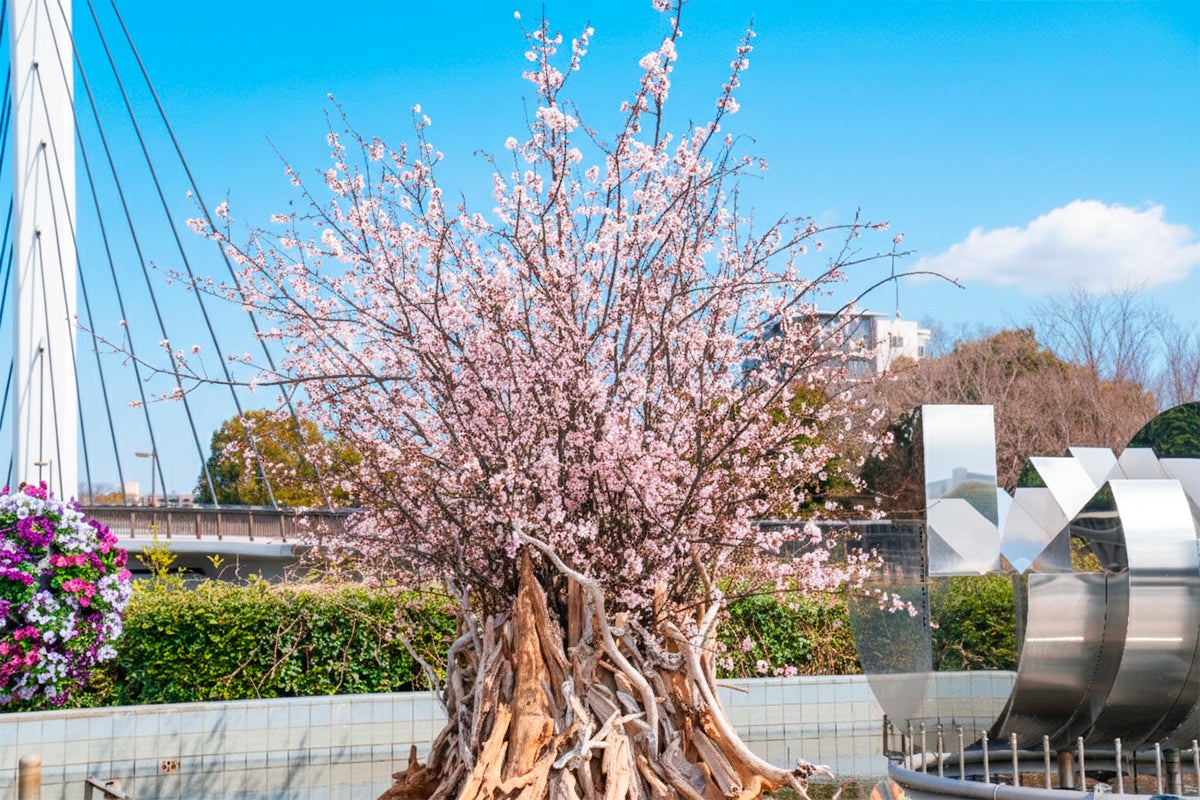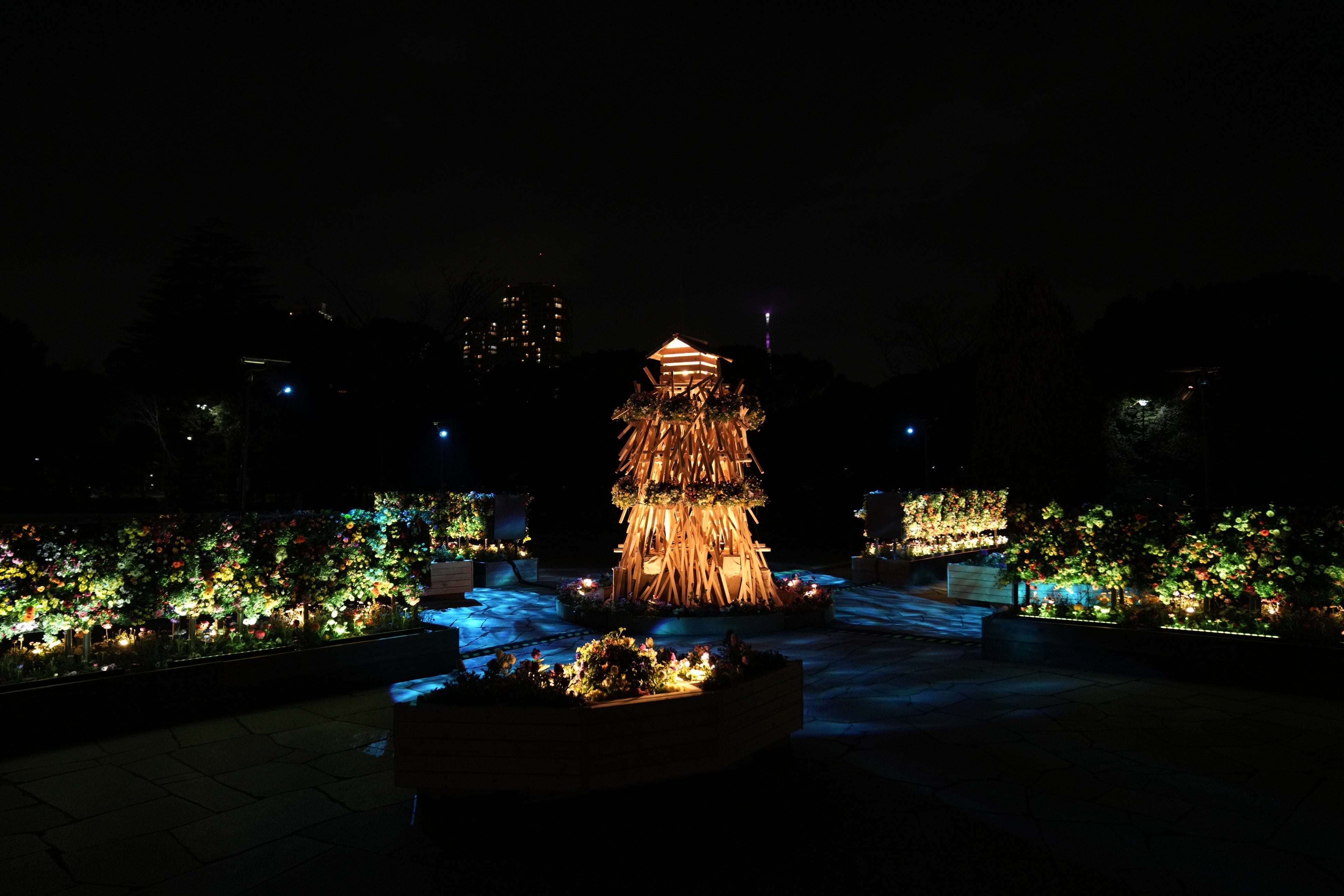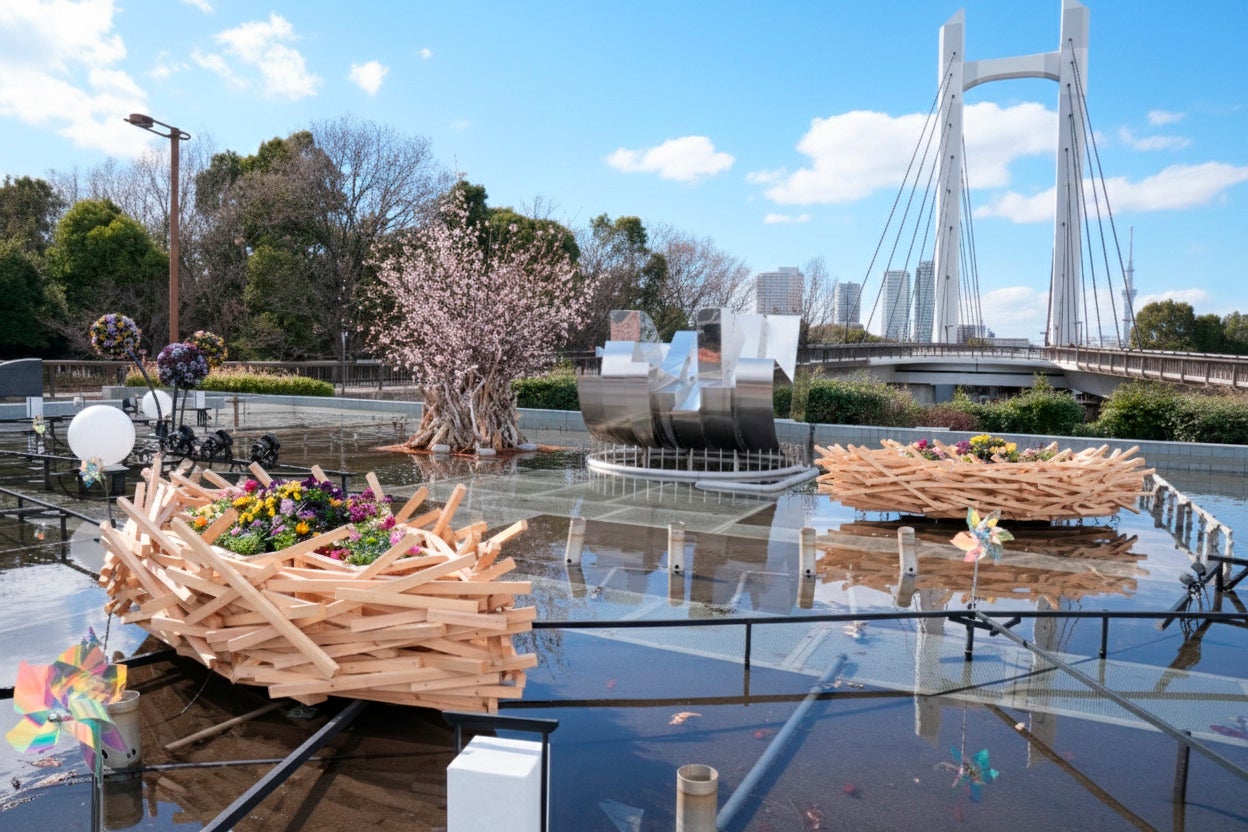 【東京・木場公園】咲き誇る桜と光り輝く立体花壇。高さ3.5m「角材の常夜灯」が誘う早春の花のイルミネーション。地域の園児も花植えに参加、日中も夜も美しい「光と花の17日間」が開始!