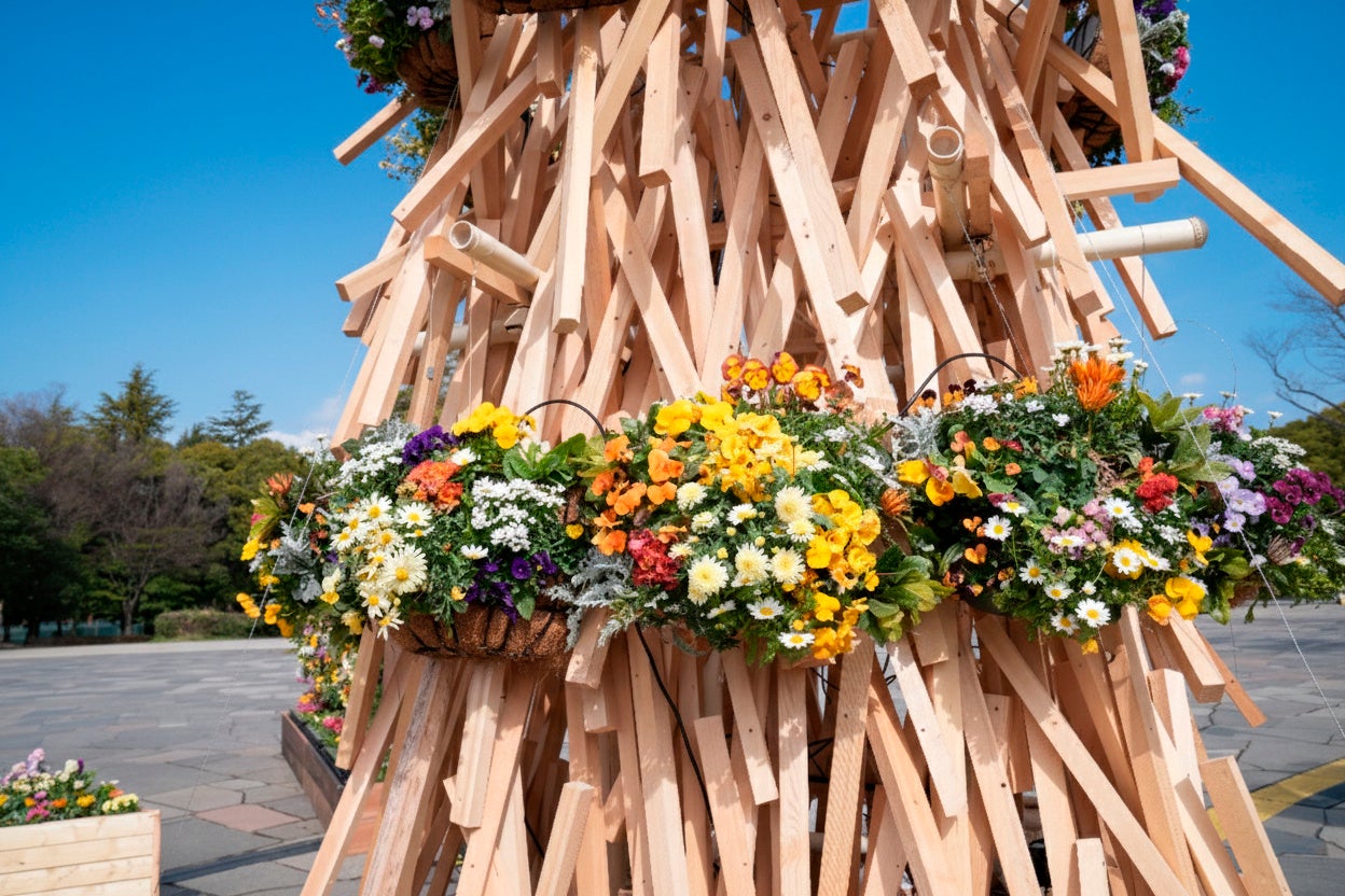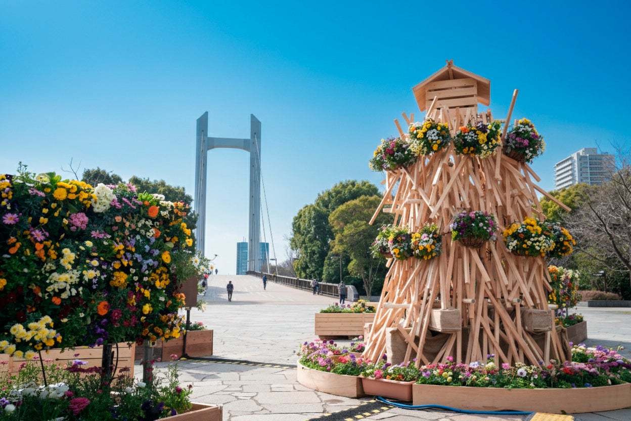 イベント広場の中央には、かつて木場の水路を照らした灯を思わせる、高さ約3.5mの常夜灯オブジェが登場。江戸時代から伝わる、水辺に浮かべた材木を鳶口で乗りこなす「木場の角乗(かくのり)」の象徴でもある角材を使い、その質感に合わせて日比谷花壇が厳選した季節の花々を鮮やかに植え込みました。花屋の知見を活かし、色彩の重なりや品種の個性を引き出すことで、木の風合いと早春の花々が調和した、一体感のある景観を実現しています。