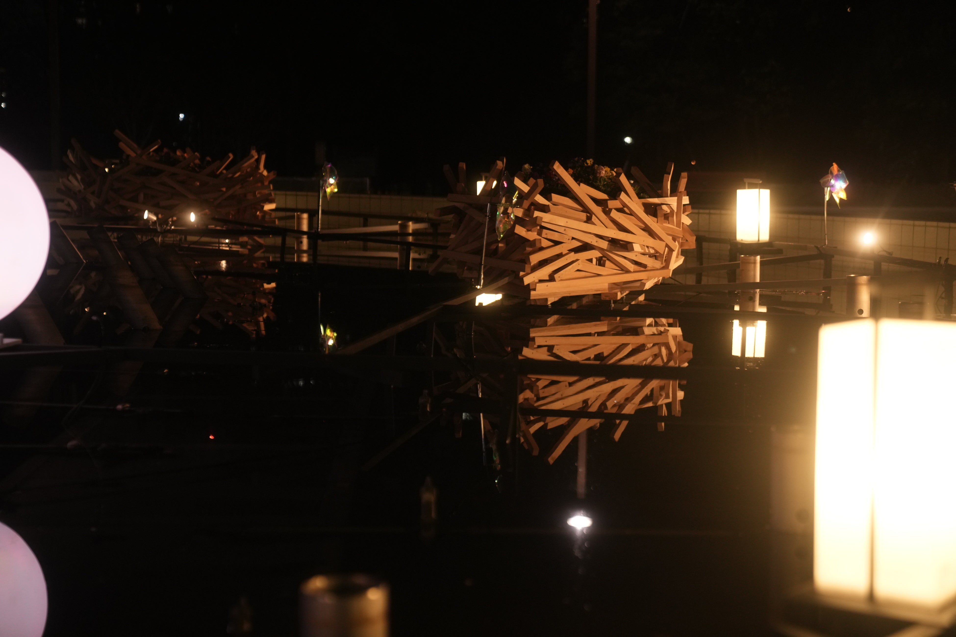 夜の幻想的なイベント広場 高さ約3.5m「角材の常夜灯」