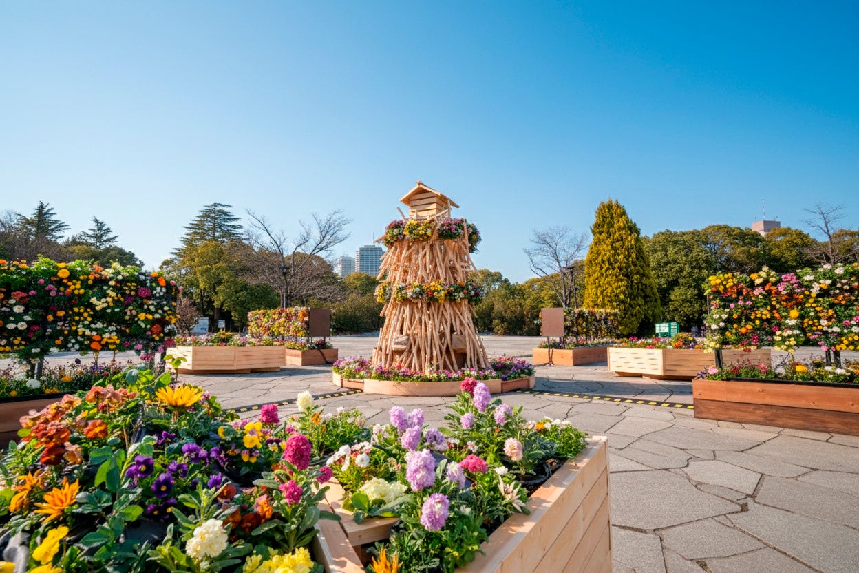 株式会社日比谷花壇(本社:東京都港区、代表取締役社長:宮島浩彰)は、東京都が実施している、四季を通じた花と光の演出によって公園の新しい楽しみ方をお届けするプログラム「花と光のムーブメント」において、2026年2月27日(金)~3月15日(日)に開催される、イルミネーションイベント「花と光のムーブメント 木場公園『風と灯のめぐり路~花が舞う早春の輝~』」の装飾を担当しました。