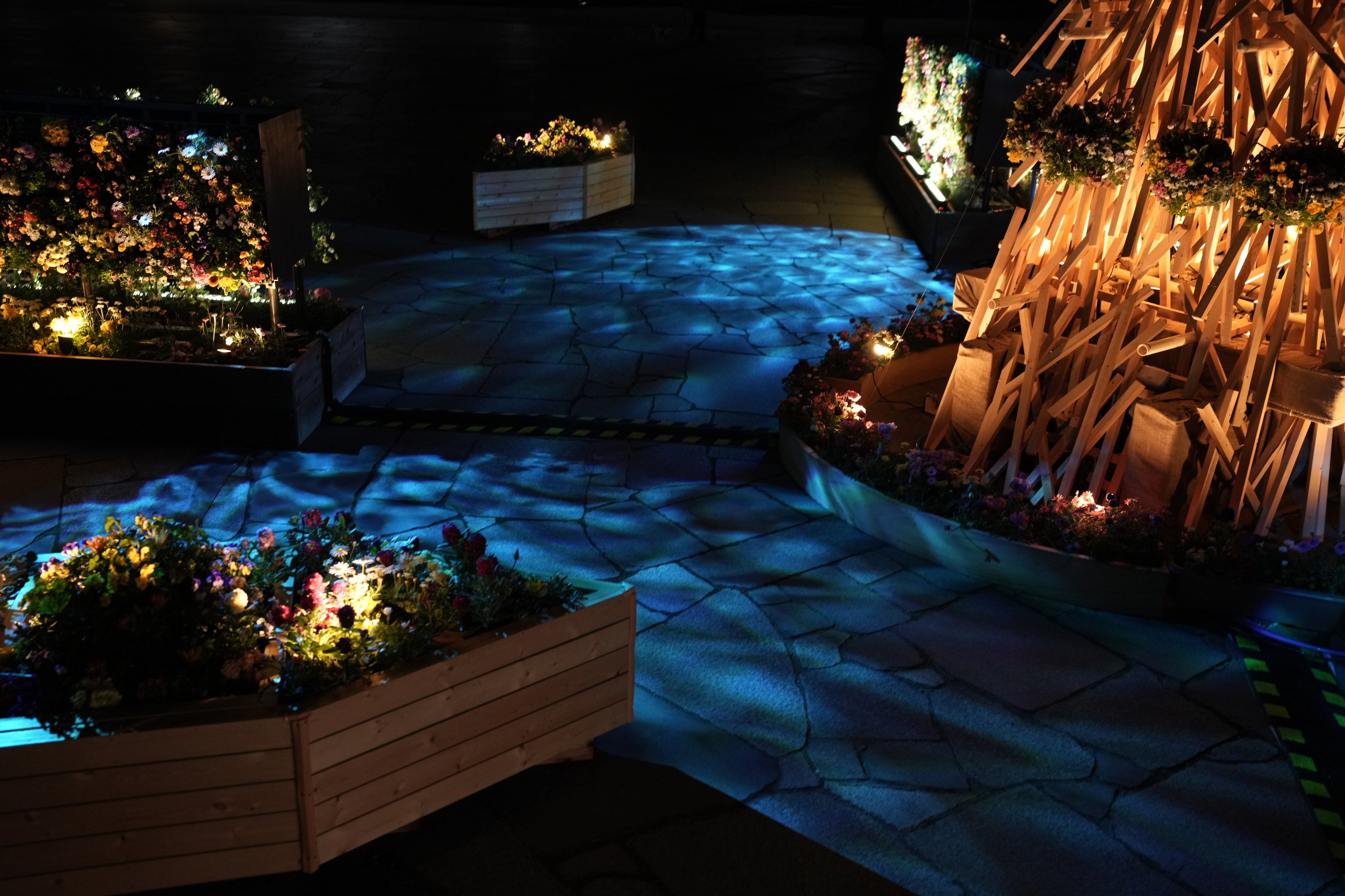 そして、日中と夜間で異なる表情を見せる圧倒的な没入体験を創出するとともに、地域とのつながりを大切にした空間づくりの一環として、装飾の一部には木場公園近隣の保育園児が植栽に参加しました。子どもたちが心を込めて植えた花々が、早春の風景にさらなる彩りを添えています。