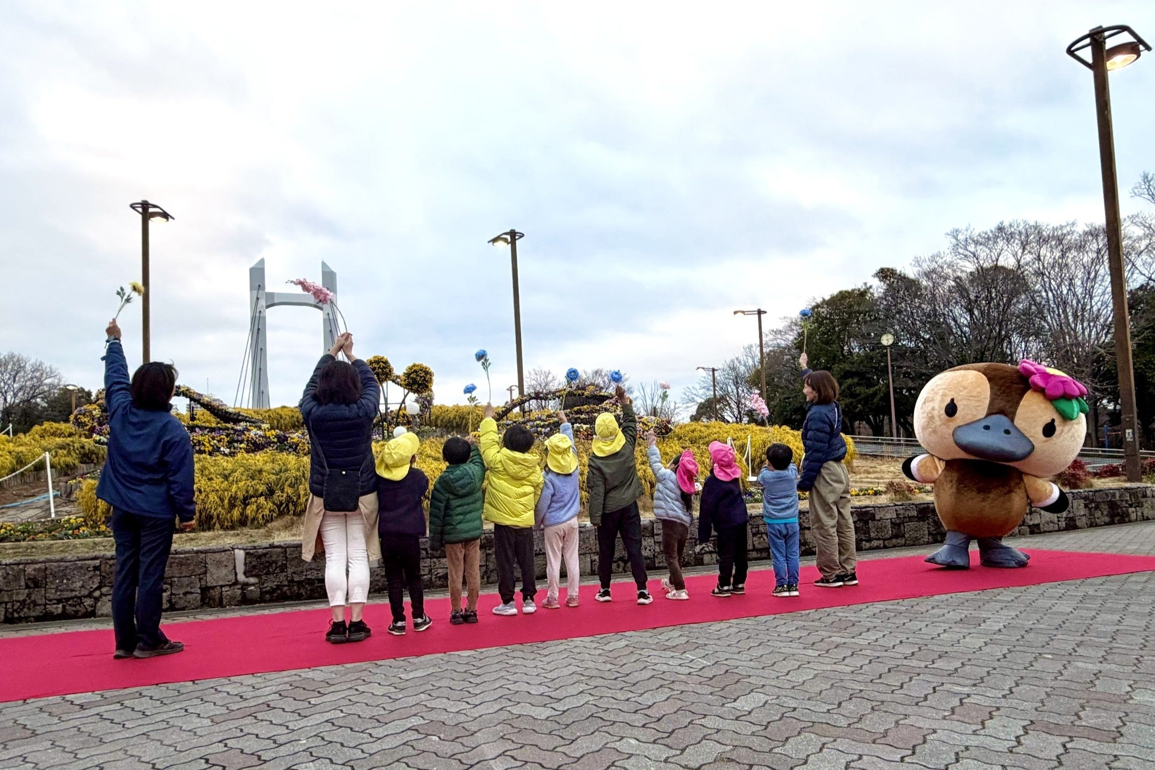 開催前日に実施したイルミネーション点灯式では、木場公園の公園長のほか、江東区観光キャラクターのコトミちゃんや、一部装飾の植栽に参加した木場公園近隣の保育園児たちも登壇。子どもたちの元気な掛け声とともに、イルミネーションが点灯しました。
