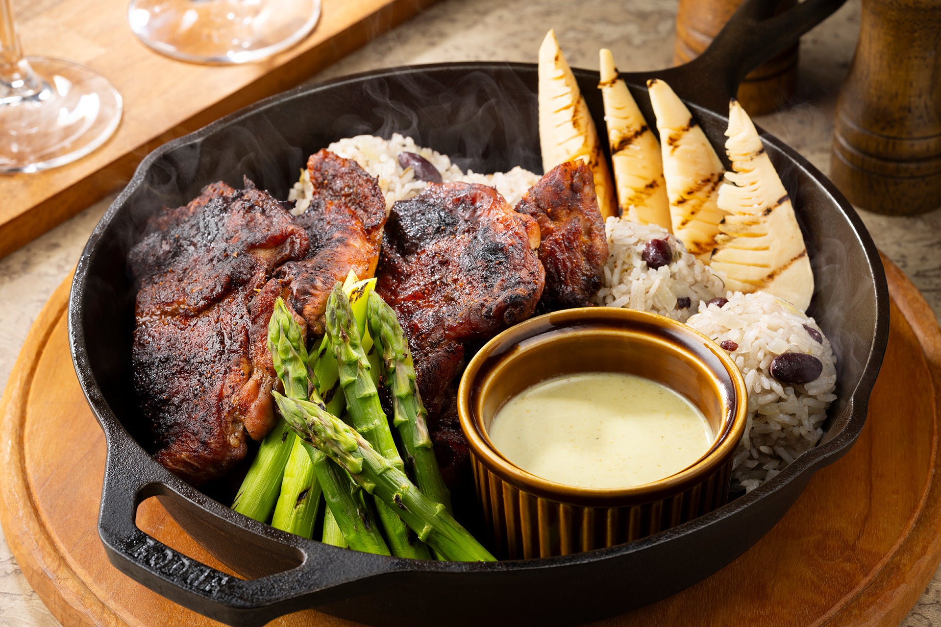 グリルした旬の筍とアスパラガス ライスアンドピーズを添えて
