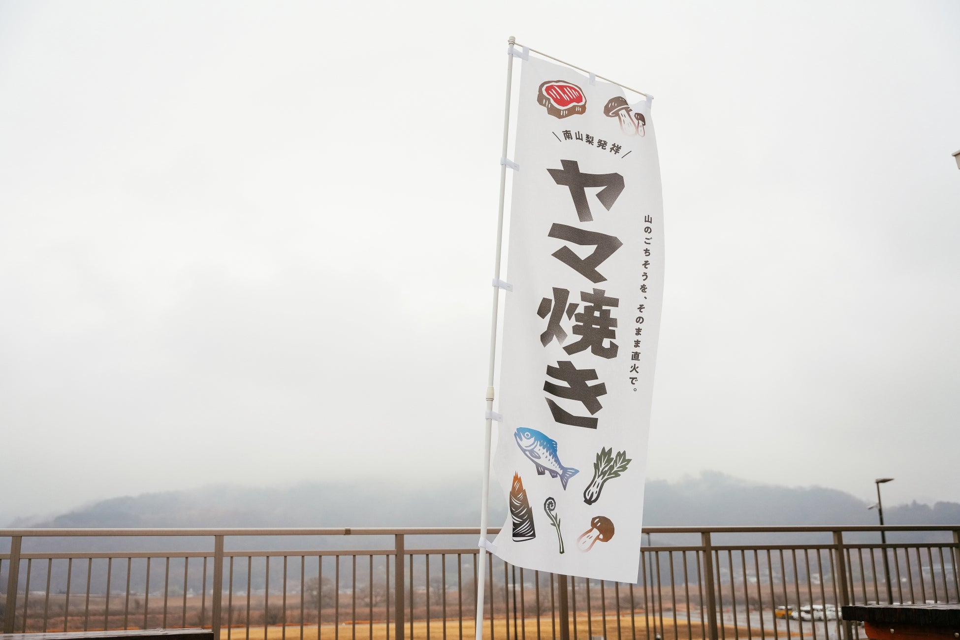 3月7日(土)より本プロジェクトのフラッグシップ拠点である、「道の駅富士川」2階テラスにて『ヤマ焼き』の食材セットが提供されます。来場者は炭火を囲み、特製の“焼き方ガイド”を参考にしながら、食材を最適な状態で焼き上げ、山の幸を堪能いただけます。