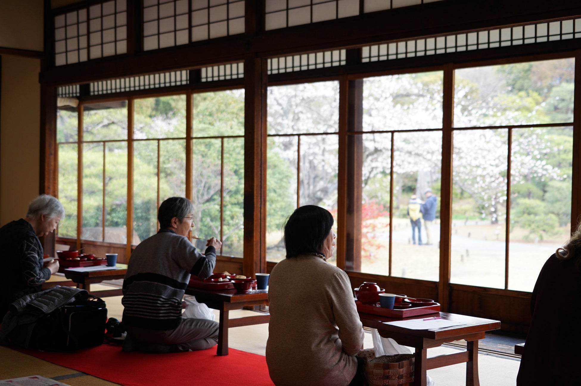 小池に面した、通常は非公開のお茶室にて、東本願寺オリジナル和菓子「豆小紋」とお抹茶をお楽しみいただく呈茶、または、仏さまにおそなえしたご飯(お仏供)のおさがりを用いて調理した「菜の花粥」をはじめ、炊き合わせ、東本願寺境内でとれた梅を使った梅干しなどを、朱塗りの器に盛り付けた本格的なお膳をご提供いたします。いずれも、この期間だけの特別な内容です。