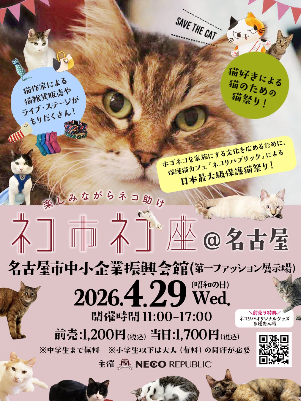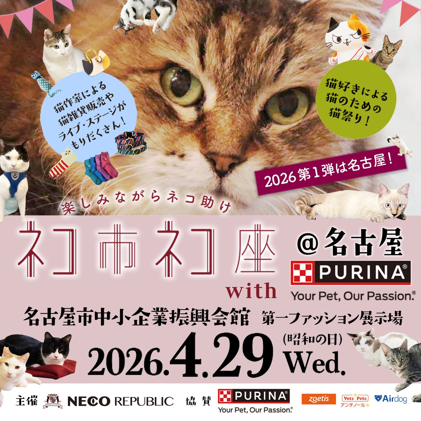 株式会社ネコリパブリック(本社:東京都台東区、代表取締役:河瀬麻花)は、2026年4月29日(水・祝日)に愛知県名古屋市の名古屋市中小企業振興会館第一ファッション展示場(吹上ホール)にて、日本最大級の保護猫チャリティイベント「ネコ市ネコ座@名古屋 with ピュリナ」を開催します。