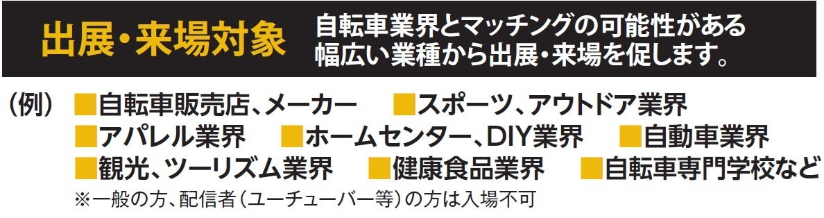 現在、自転車業界は市場環境の激しい変化の中にあります。本展は、単なる製品発表の場に留まらず、国内のメーカー、卸、小売店といった「プロ」達が手を取り合い、新たな商機を創出する「日本の自転車産業をつなぐ展示商談会」を目指します。
