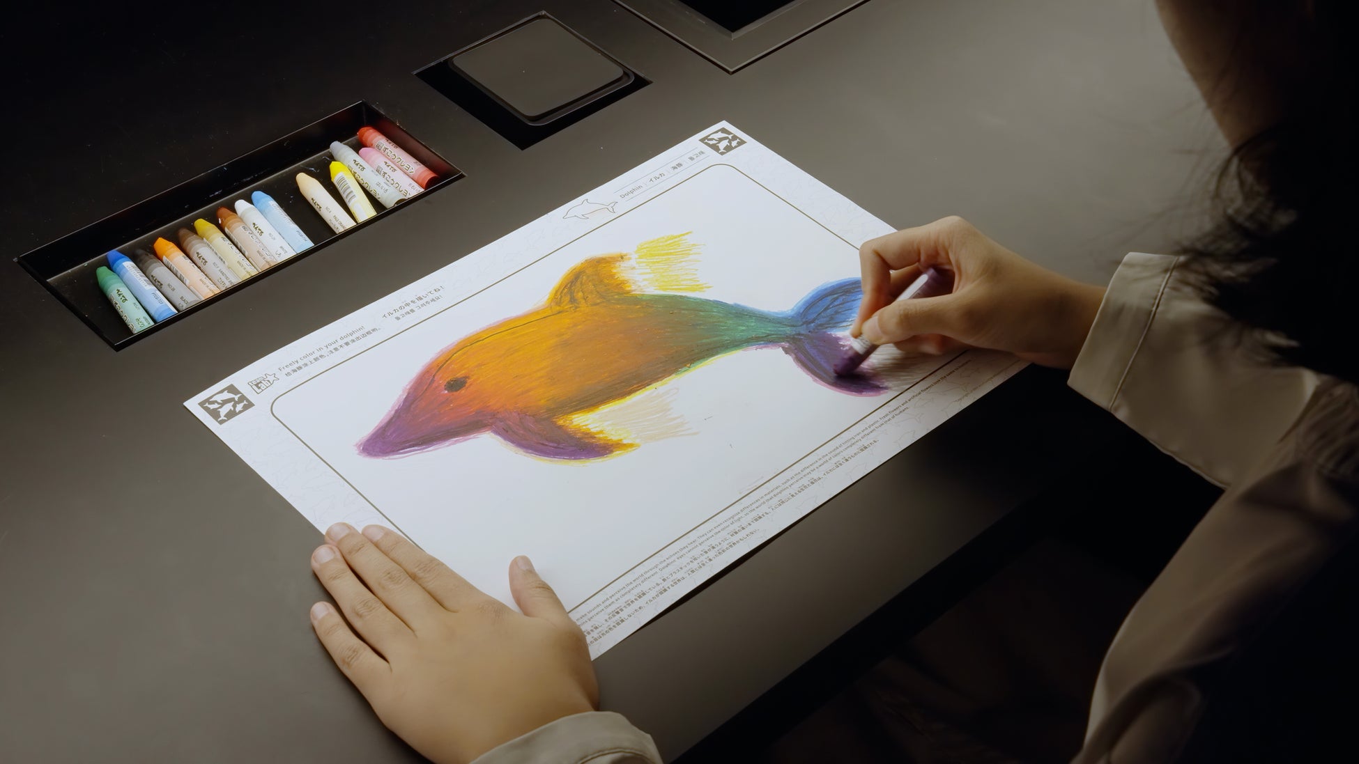 紙にヒコーキや、イルカ、タカ、チョウの絵を描く。すると、描いた絵が目の前に立体で出現し、世界に飛び立つ。飛び回るヒコーキやイルカ、タカ、チョウに触ると、加速したり、逃げたりする。
