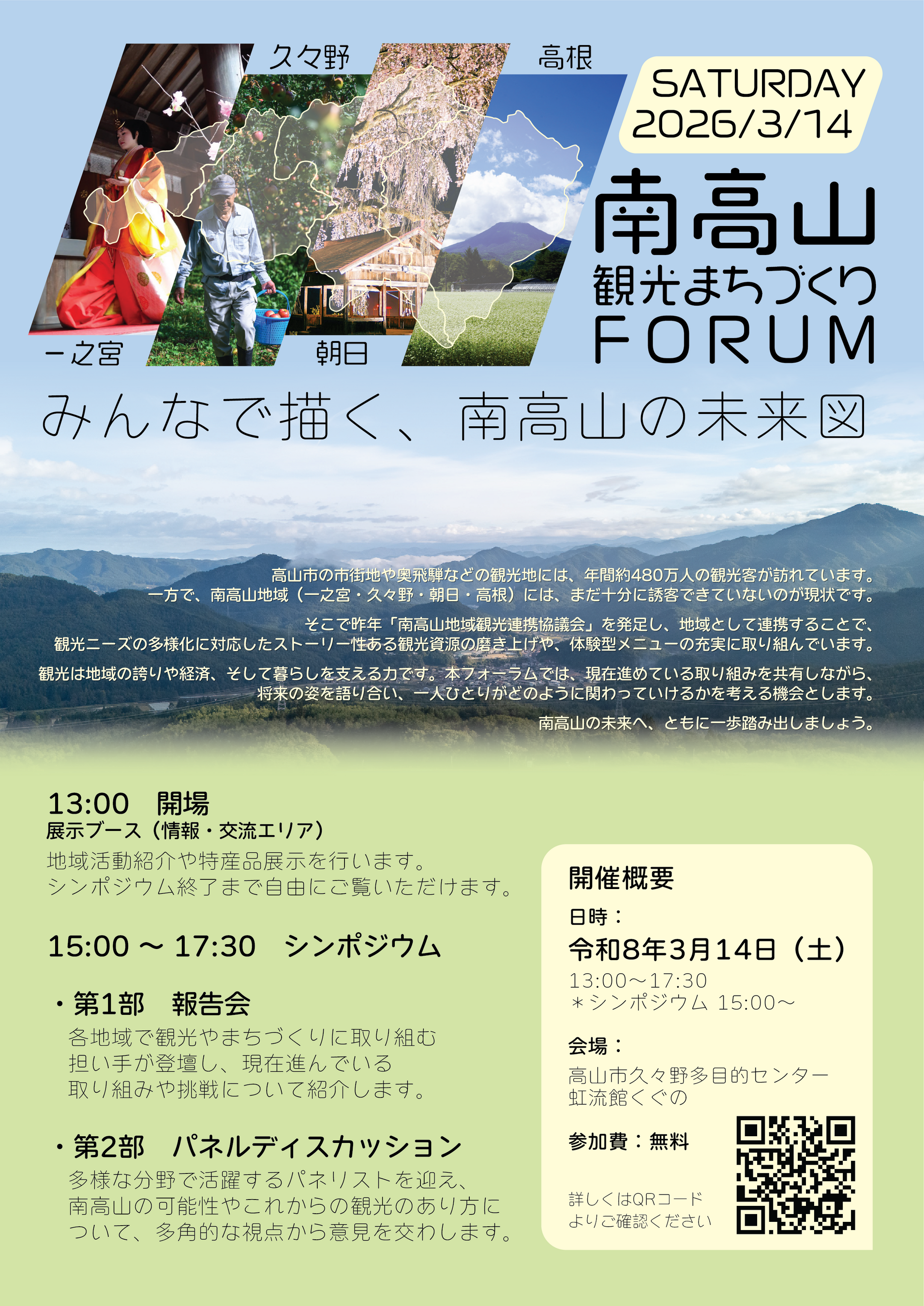 観光は地域の誇りや経済、そして暮らしを支える力です。「フォーラム」は、現在各地域ですすめられている取組みを共有しながら、南高山の将来の姿を語り合い、私たち一人ひとりがどのように関わっていけるかを考えていく機会とします。地域の人々の日々の暮らしにこそ、全てがつまっています。みんなで南高山の未来図を描いていくために、多くの皆様のご来場をお待ちしております。