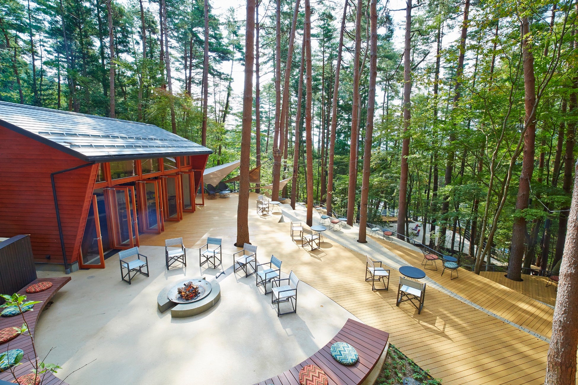 河口湖を望む丘陵に溶け込むように建つ、日本初のグランピングリゾート* 。焚き火を眺めながら過ごすひと時、広大なアカマツの森の中で愉しめる体験型の食事、自然の中で身体を動かす爽快感。常に屋外で快適に過ごせる環境の中、四季を通して新しい価値を提供します。
