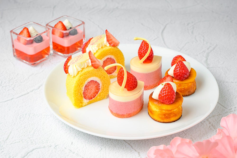 スイーツ全6種 :カルダモン香るバスクチーズケーキ、能登大納言といちごのシュークリーム、フレーズ・ラルム “いちごの涙”、いちごのモンブランタルト、宇治抹茶のミルクレープ、いちごのロールケーキ