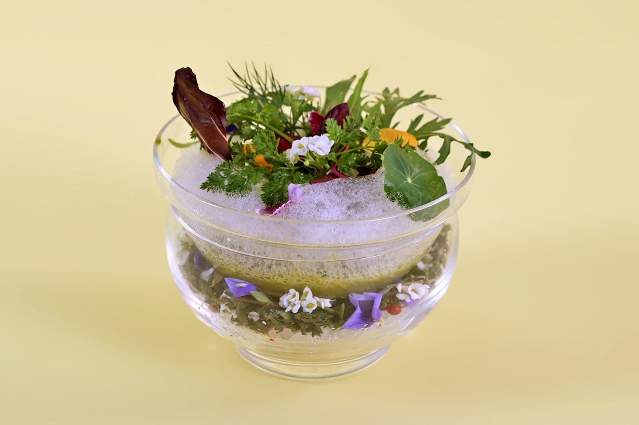 スモークサーモン、トマトコンフィ、セロリのピクルス、キュウリ、ビーツのマリネ、レモンの泡やタプナードマヨネーズ、バジルオイルなど多彩な食材で食感が楽しめるサラダ。