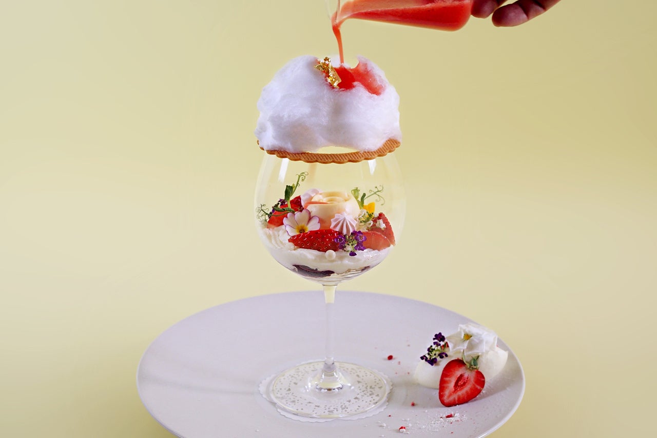 コットンキャンディーに閉ざされたパフェグラスには、薔薇型のアーモンドババロワを中心に小さな春が。香ばしいパイクラム、クレームディプロマット、ラベンダーとカシスのジュレ、シャンティーマスカルポーネ、エディブルフラワー、あまりん、苺のメレンゲと層をなします。あまりんソースをかけてお召し上がりください。