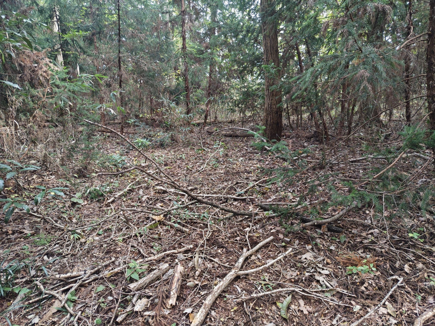 平地中心でありながら、森の表情は濃く、広葉樹のやわらかな木漏れ日と、周囲を囲む針葉樹の深い緑が共存する風景が広がっています。