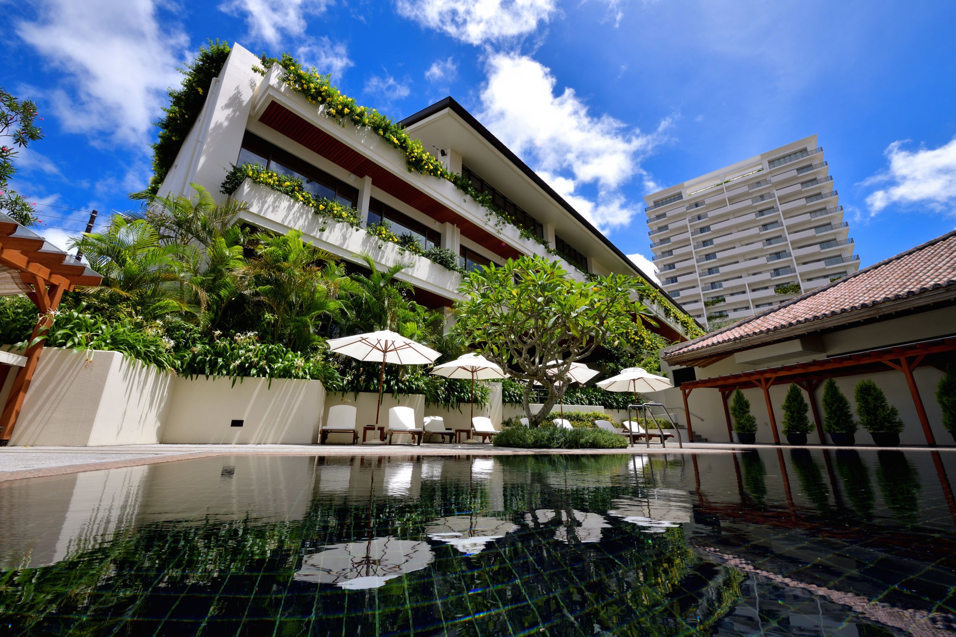 都心部にありながらも閑静な環境とビジネスにも観光にも優れた利便性、シンプルで落ち着いた空間が南国のラグジュアリーリゾートを演出します。