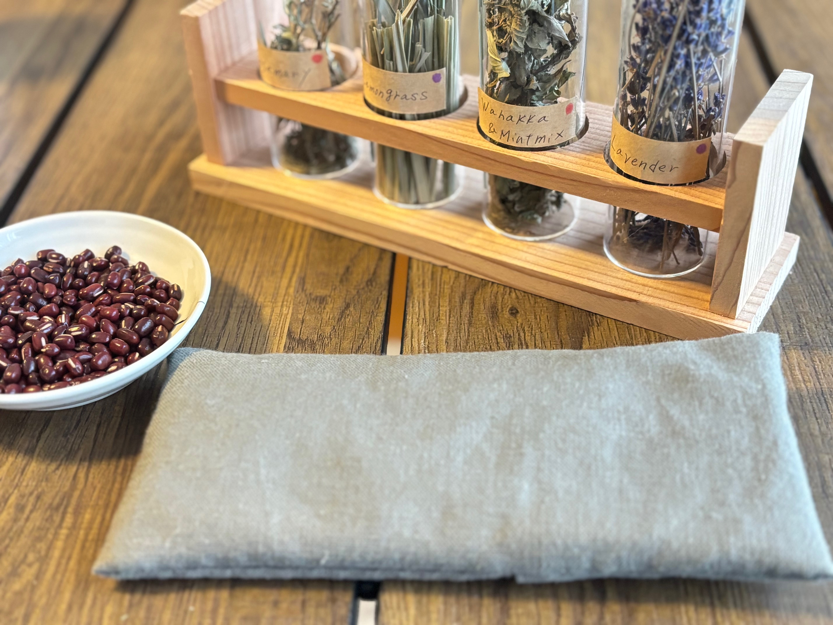 三島ハーブ園が栽培・加工した香り高いハーブと、北海道産の小豆を組み合わせ、目元に乗せてリラックスを促す「アイピロー(目枕)」を制作します。水分を多く含む小豆は、電子レンジで温めることで天然の蒸気が発生する特性があり、その温熱と適度な重みが目元の緊張をじんわりとほぐします。農薬・化学肥料不使用ハーブの豊かな香りと共に、質の高い眠りの環境を整えるセルフケアアイテムとして、ご自宅でも繰り返し使用いただくことが可能です。