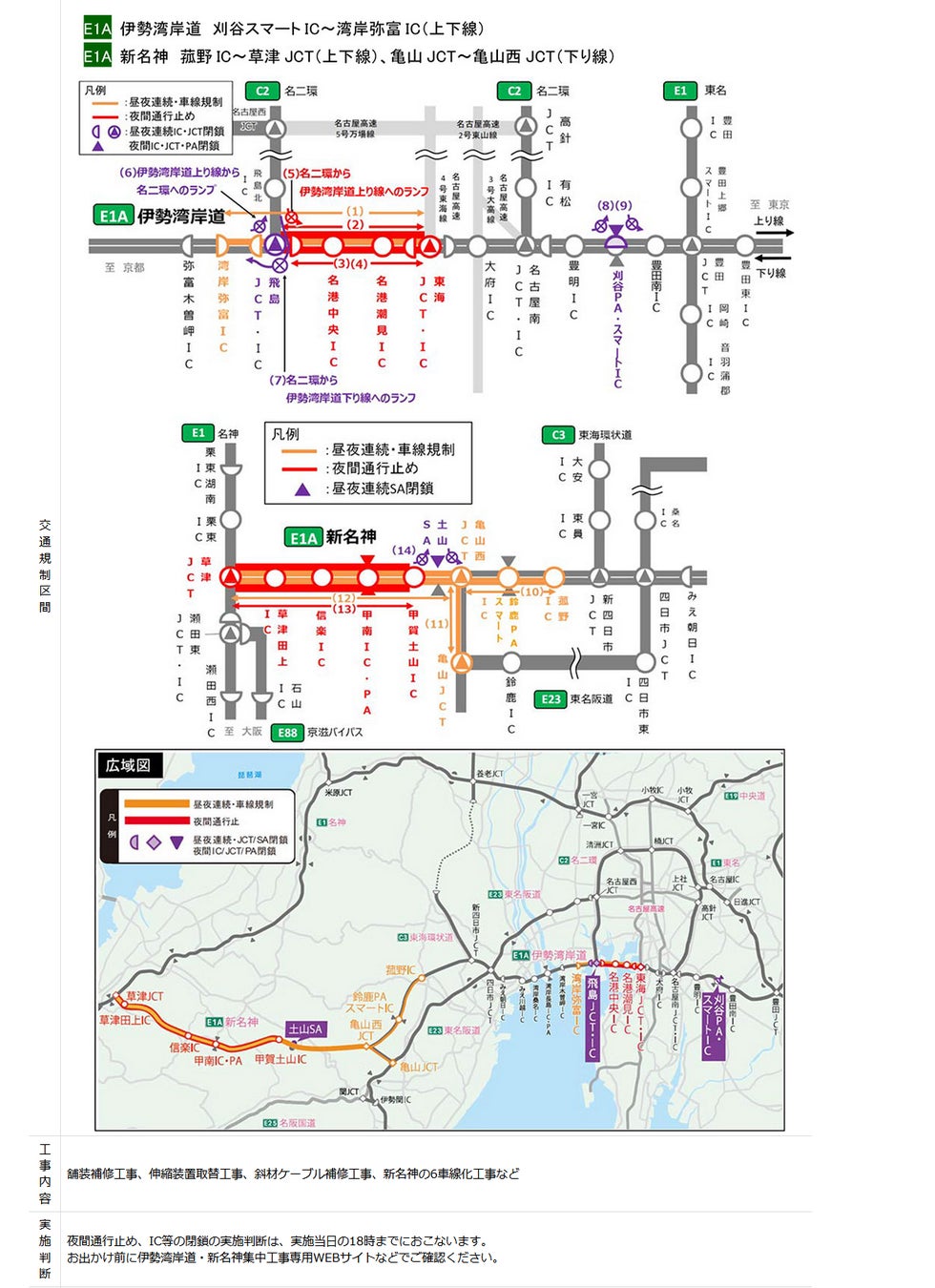 NEXCO中日本 名古屋支社(名古屋市中区、支社長・前川 利聡)とNEXCO西日本 関西支社(大阪府茨木市、支社長・諸富 正和)は、安全を何よりも優先し、安心で快適に高速道路をご利用いただくため、5月11日(月)23時から6月30日(火)6時までの間、E1A伊勢湾岸自動車道(伊勢湾岸道)刈谷スマートインターチェンジ(IC)~湾岸弥富IC(上下線)およびE1A新名神高速道路(新名神)菰野IC~草津ジャンクション(JCT)(上下線)、亀山JCT~亀山西JCT(下り線)で集中工事(昼夜連続・車線規制、夜間通行止め、昼夜連続JCT/SA閉鎖、夜間IC/JCT/PA閉鎖)を実施します。