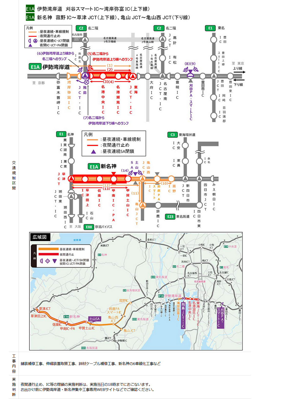 NEXCO中日本 名古屋支社(名古屋市中区、支社長・前川 利聡)とNEXCO西日本 関西支社(大阪府茨木市、支社長・諸富 正和)は、安全を何よりも優先し、安心で快適に高速道路をご利用いただくため、5月11日(月)23時から6月30日(火)6時までの間、E1A伊勢湾岸自動車道(伊勢湾岸道)刈谷スマートインターチェンジ(IC)~湾岸弥富IC(上下線)およびE1A新名神高速道路(新名神)菰野IC~草津ジャンクション(JCT)(上下線)、亀山JCT~亀山西JCT(下り線)で集中工事(昼夜連続・車線規制、夜間通行止め、昼夜連続JCT/SA閉鎖、夜間IC/JCT/PA閉鎖)を実施します。