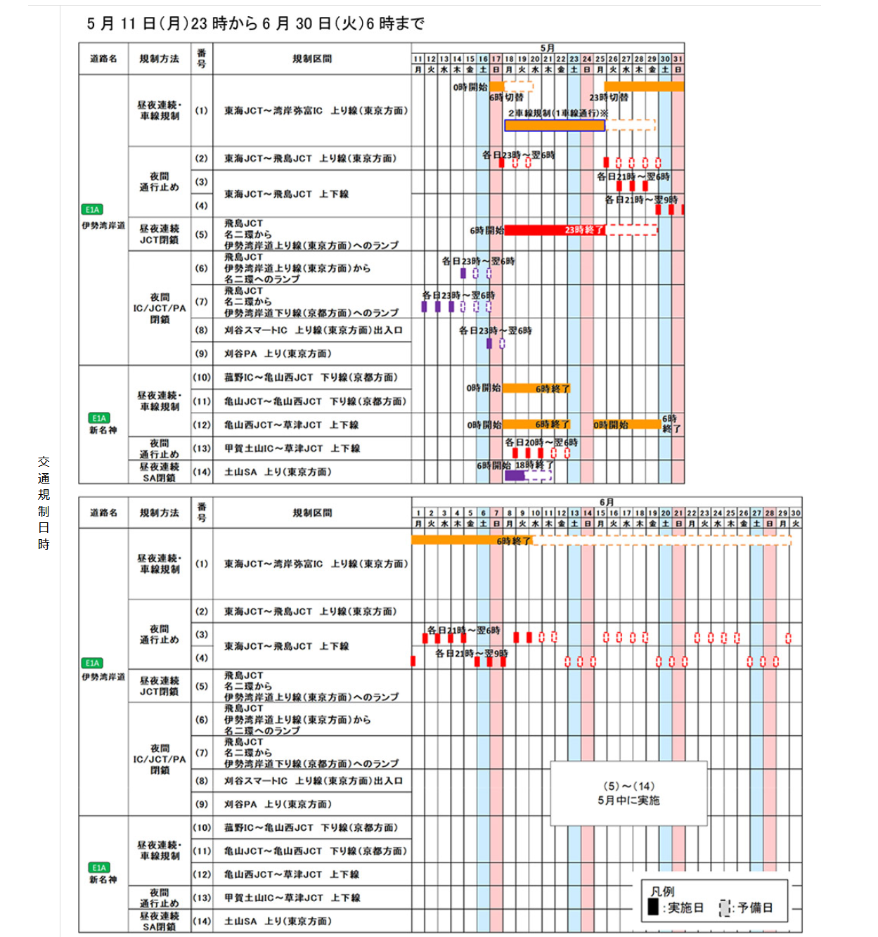 ― 5月11日(月)23時から6月30日(火)6時まで ― ― E1 東名・名神、C2名二環、E23東名阪道、E25名阪国道、名古屋高速などへの迂回をお願いいたします ―