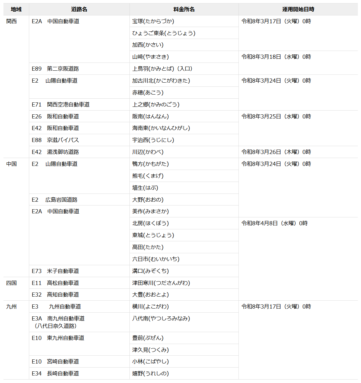 NEXCO西日本(大阪市北区、代表取締役社長:芝村 善治)は、新たに30料金所をETC専用料金所として令和8年3月17日から4月8日の間で順次運用開始しますので、お知らせします。