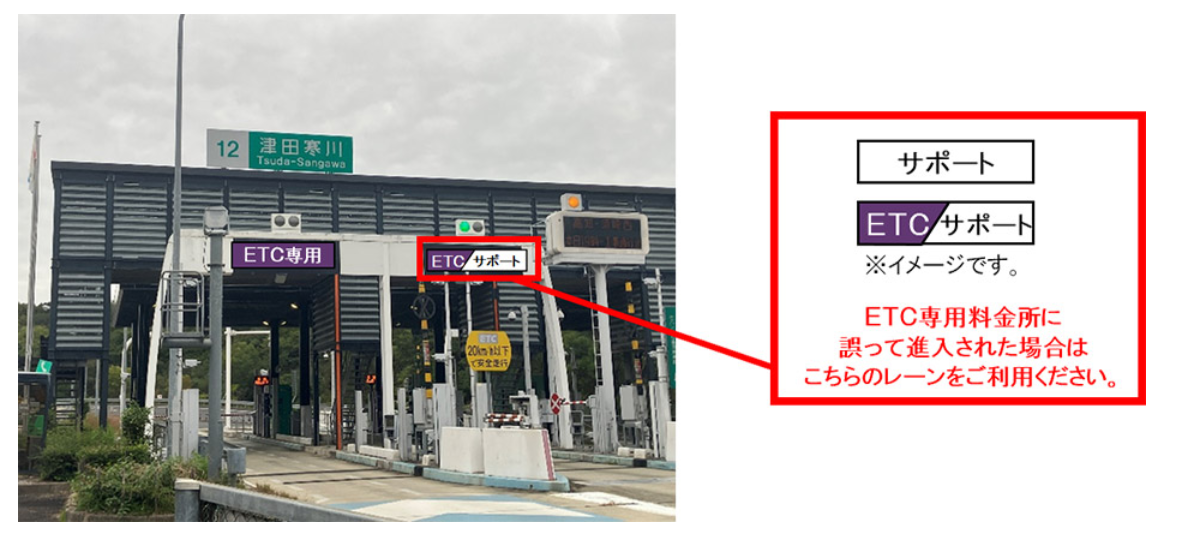 ってETC専用料金所をご利用された場合は後退・転回せずに、「サポート」又は「ETC/サポート」と