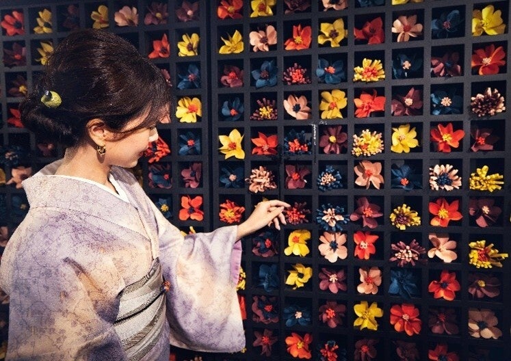 アーティフィシャルフラワーを選んで自分だけの“花みくじ”を引く参加型アート。結べば花が咲くアートに、持ち帰ればお出かけの記念に。