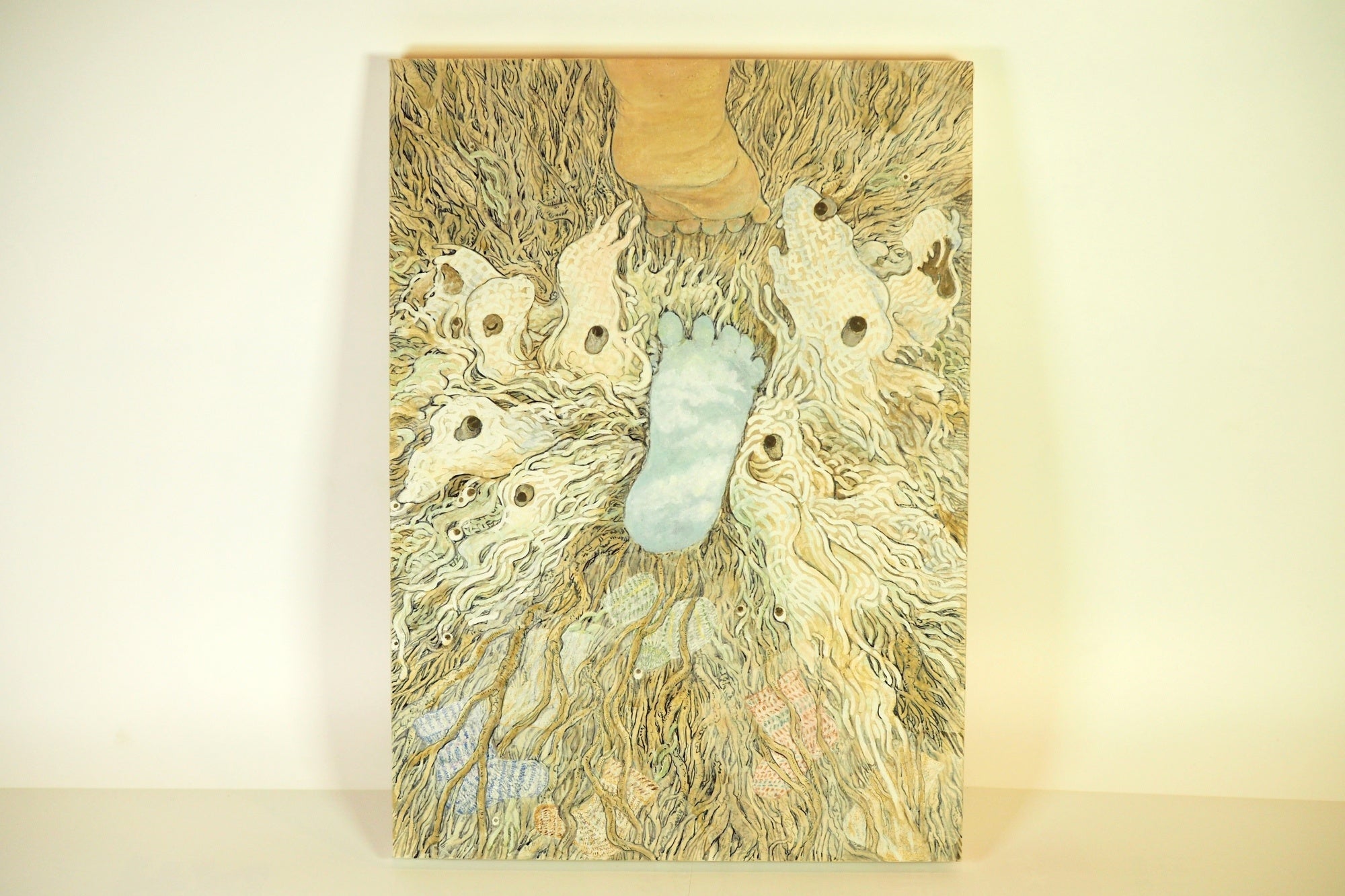 昔、地面に初心な足跡がそっとついたとき、さてどんな子だろうと小さきものたちがわらわらと様子を見に湧き出てきた。何だか冷たそうだぞ、と優しさがあみあみと重なりその足を包み込もうとしたのを見た誰かが、後に靴下となるものを発案した、という逸話がどこかにある…とか、ないとか。