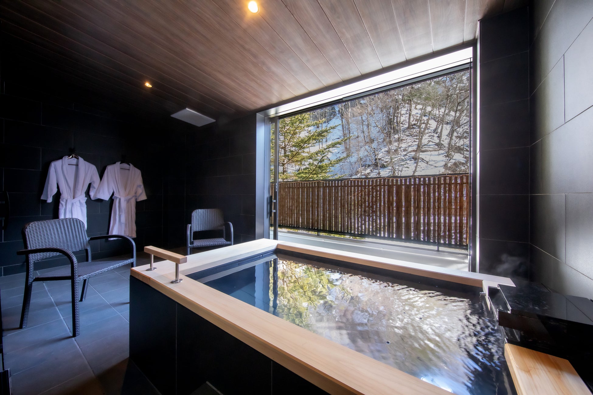 広々とした露天風呂は蓼科の新鮮な空気の中、源泉掛け流しの温泉を独り占めすることができます。湯へ向かう足元には、床暖房も備わっているため、冬でも心地よく使用することが可能です。