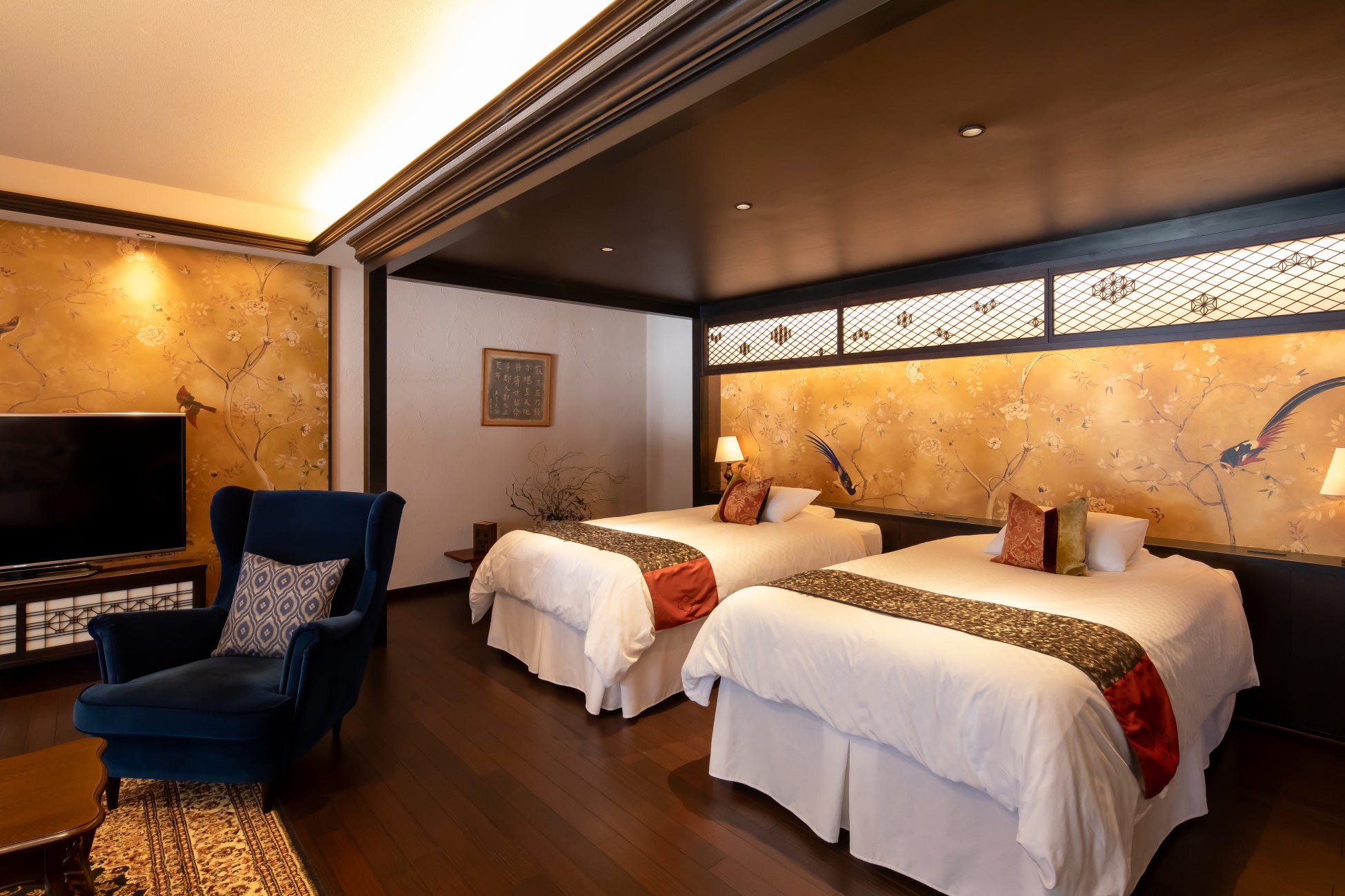 シノワズリの壁紙を配した「伊藤左千夫スイート」のベッドスペース