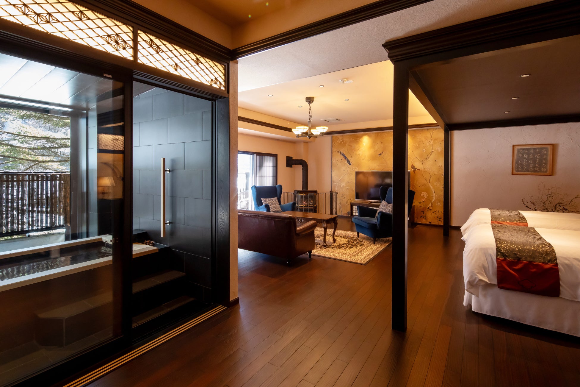 蓼科 親湯温泉と縁ある10人の文人たちをイメージした10室の客室「蓼科倶楽部」。その内2室を露天風呂付き客室にリニューアルし、2月にオープンしました。露天風呂と文人の滞在の追体験を同時に楽しめる、当館最上級の客室です。各部屋はそれぞれ相応しい家具やシノワズリを配した麗しの空間で「伊藤左千夫スイート」と「柳原白蓮スイート」として表現しました。