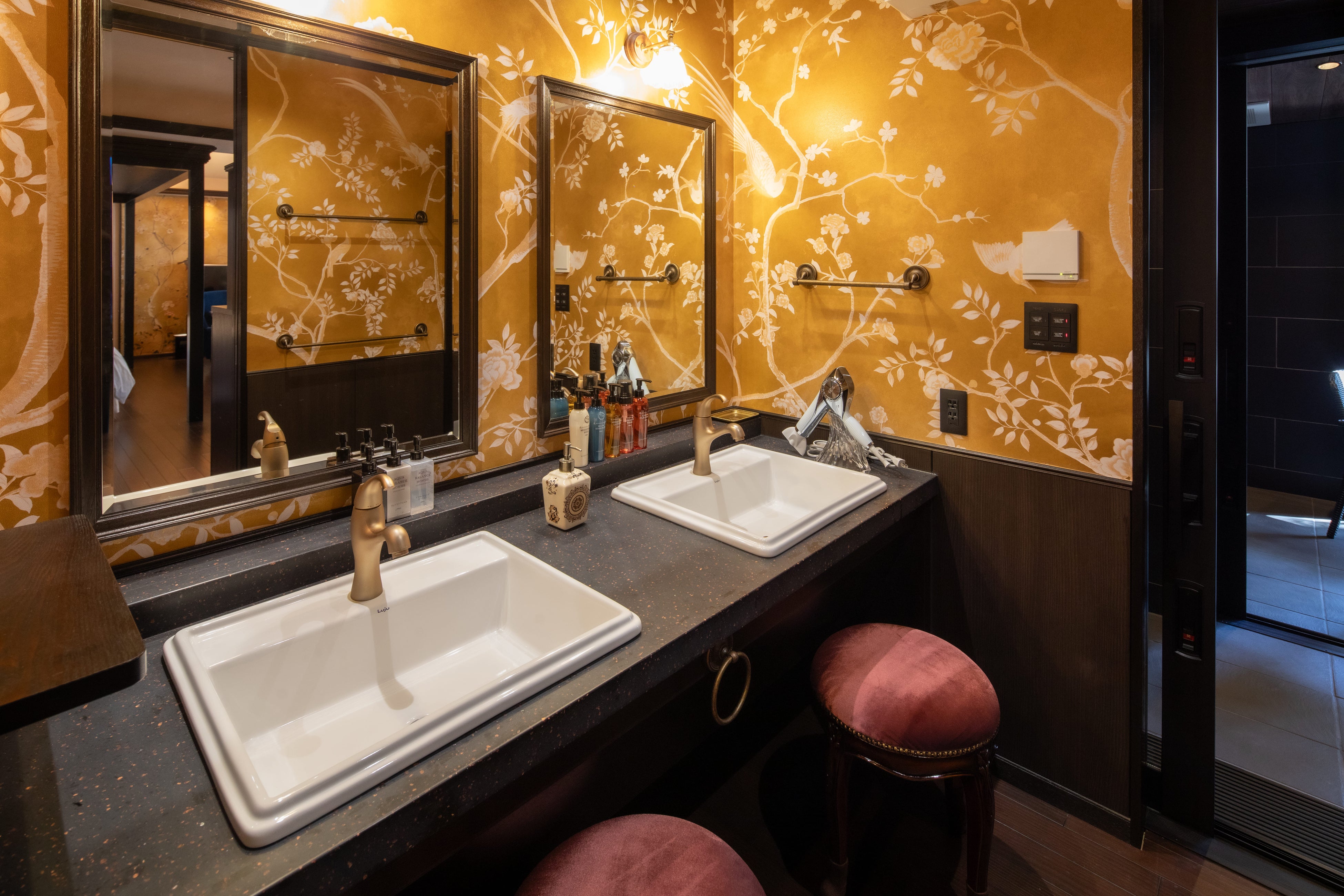 洗面にもシノワズリの壁紙を使用
