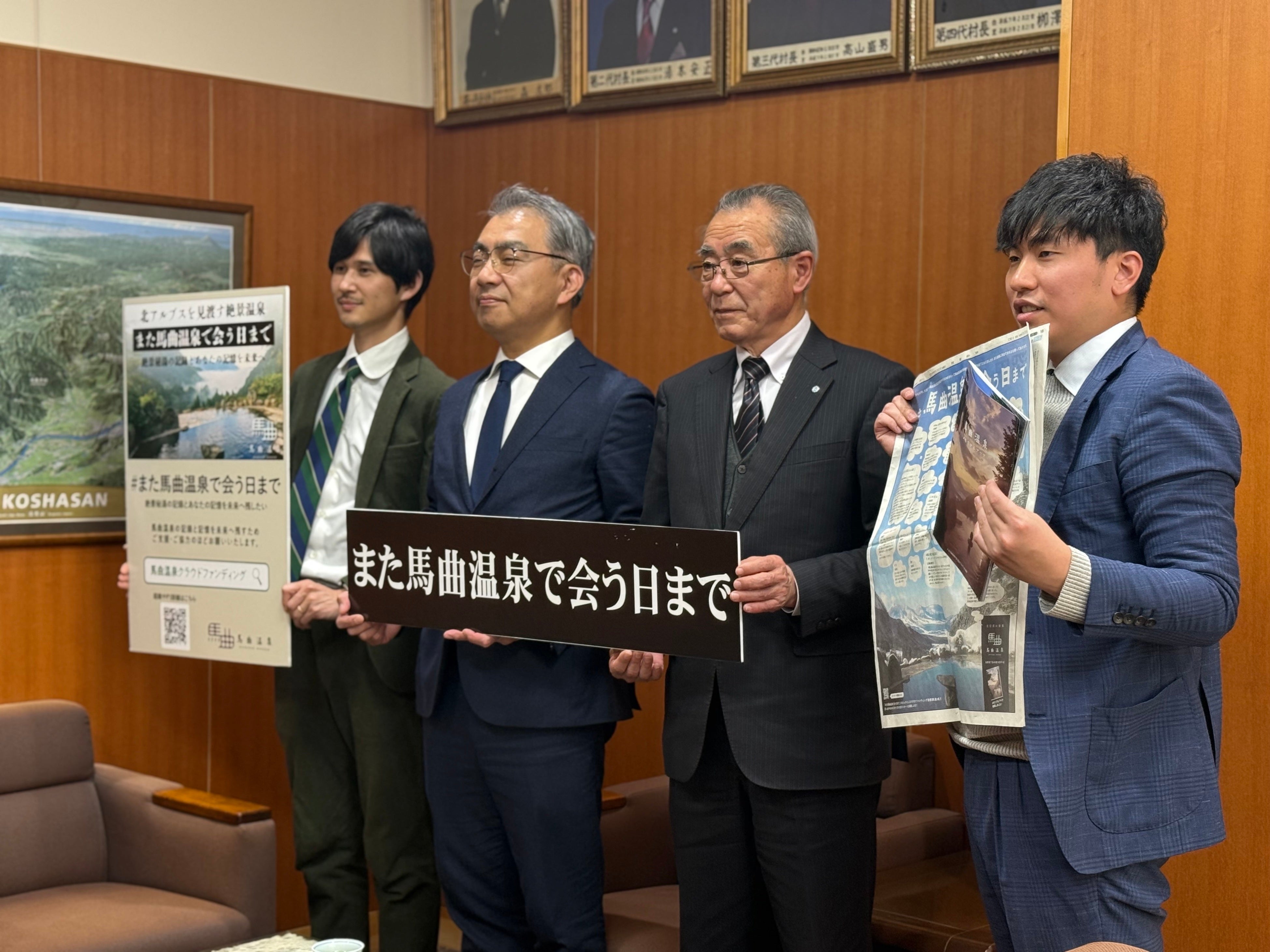 馬曲温泉株式会社(所在地:長野県木島平村、代表取締役:徳安 素一郎)は、2026年2月26(木)、木島平村役場にて木島平村長 日䑓 正博(ひだい まさひろ)村長を表敬訪問し、プロジェクト「#また馬曲温泉で会う日まで」の活動報告を行いました。