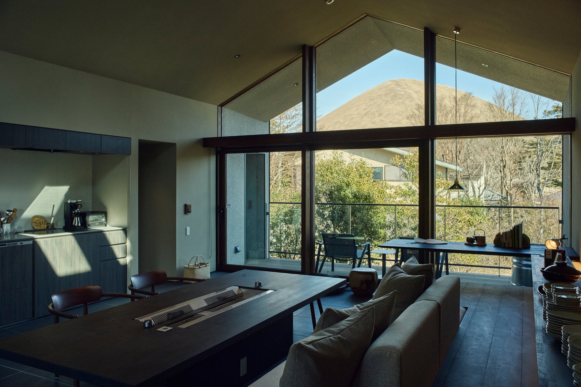 近年、一棟貸しのバケーションレンタルやキャンプ、BBQなど、仲間や家族と火を囲む滞在スタイルが広がっている一方で、設営や準備に時間を要したり、天候や季節に左右されたりと、「火を囲む時間そのもの」をゆったりと楽しむことが難しい場面もあります。本施設はこうした課題に着目し、火を囲む時間をもっと快適に、もっと長く、もっと深く味わえる場を追求しました。そこで、日本の伝統的な囲炉裏をラウンジのようにくつろげる高さと設えにアップデートし、天候に左右されないリビングの空間の中で、ソファやラウンジチェアで囲む設計としました。これにより、準備や撤収に追われることなく、火と食事と会話に没頭できる環境を整えました。食材に火を入れる時間と語らう時間が自然と重なり合うことで、宿泊された方にとって特別な団欒の時間を創出します。