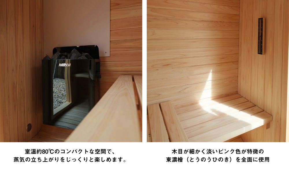 木目が細かく淡いピンク色が特徴の「東濃檜(とうのうひのき)」を室内全面に使用。少量のロウリュで立ち上がる蒸気とともに、ヒノキの香りがふわりと広がります。ストーブはフィンランドのサウナブランド「Harivia」を採用。室温約80℃のコンパクトな空間で、蒸気の立ち上がりをじっくりと味わえます。