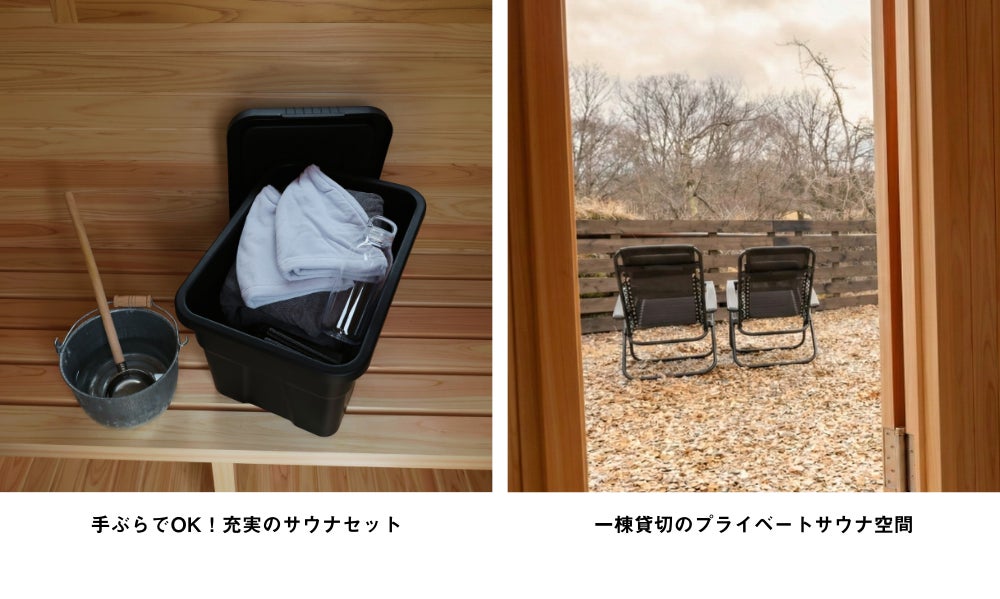 ポンチョ/マット/チェア/サンダル/タオル/ボトルを揃え、手ぶらで“ととのう”体験をご用意。