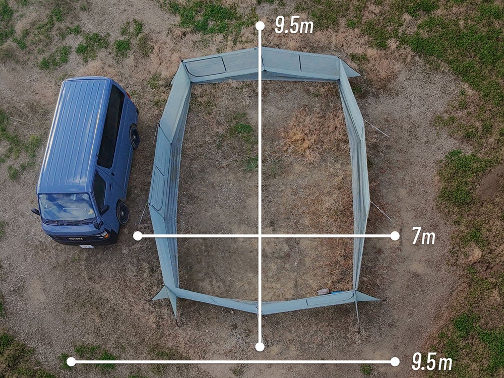 ワンダーウォールはロープを含めて9.5X7mあれば設営可能です。10X10mのテントサイトであれば車一台とワンダーウォールが入る絶妙なサイズです。