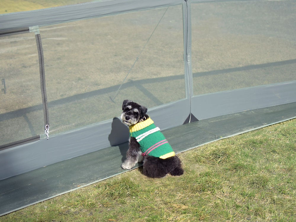 ファミリー用の大型ツールームテントでも内側に設営可能です。まるでノーリードサイト(囲い付きのキャンプサイト)のように、愛犬を自由に過ごさせることができます。