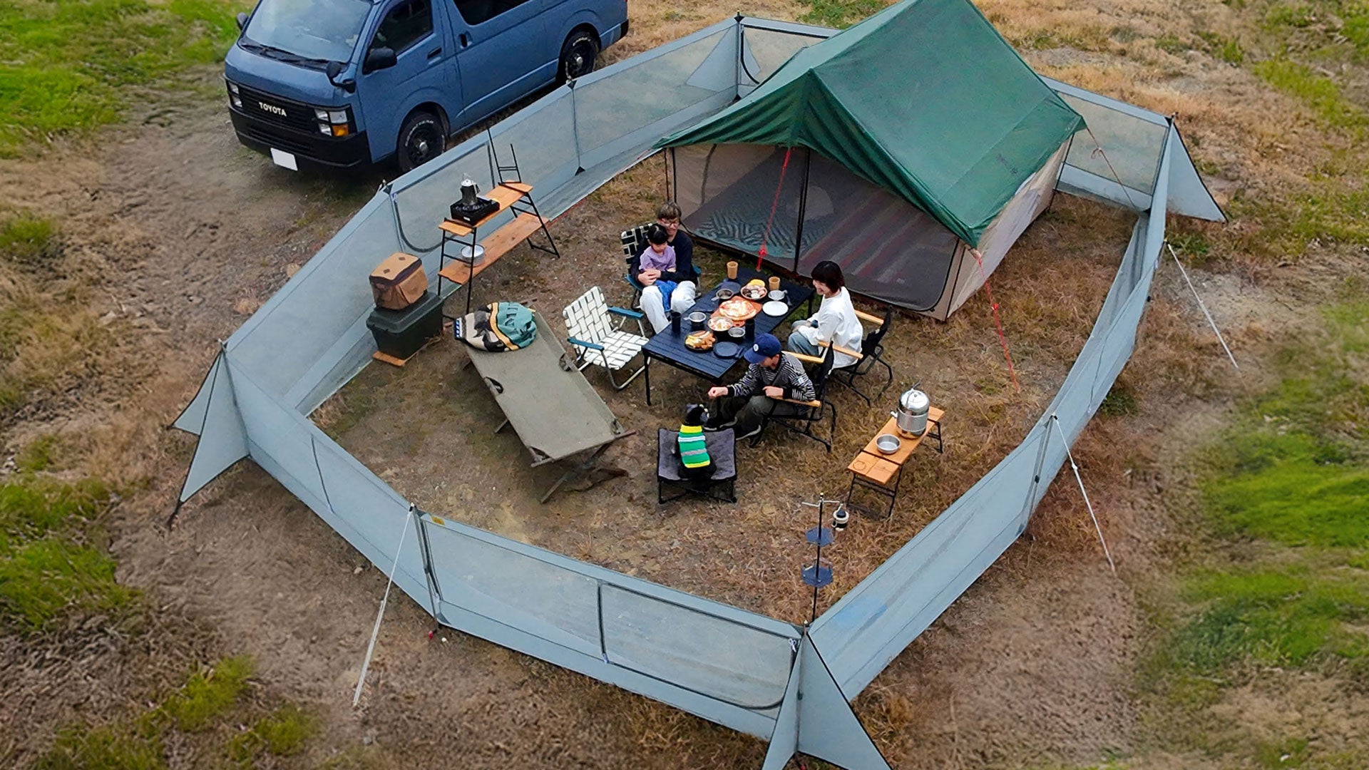 ワンダーウォールは、テントサイト全体を囲む新発想のフェンス型テント。愛犬をノーリードで過ごさせる、これまでにないキャンプスタイルを提案します。