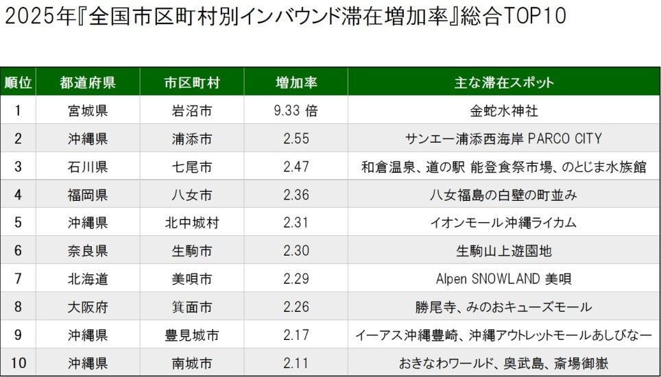 ~2025年 全国市区町村別 インバウンド滞在増加率ランキング1位は、宮城県岩沼市~