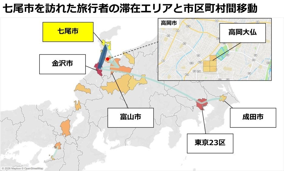 七尾市の滞在者の周遊先を確認すると、東京から大阪を北陸経由で結ぶ観光周遊ルート・レインボールートの沿線を訪れていることがわかります。あわせて滞在したエリアを確認すると、金沢市が最も多く、次いで富山市や高岡市との周遊も確認できました。なお、高岡市では高岡大仏での滞在が確認されました。