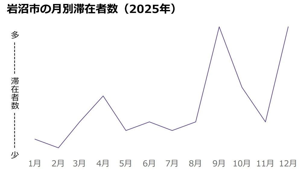 2025年の訪日外国人滞在増加率ランキングの1位は宮城県の岩沼市でした。データから9月、12月に滞在した人が多いことがわかります。岩沼市での滞在エリアを確認すると、金蛇水神社での滞在が多いことが確認できました。隣接する名取市にわたって存在する仙台空港にも滞在が確認されています。