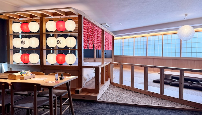 同施設は東京・中野新橋に位置し、海外から日本を訪れる観光客にも日本文化を楽しんでもらえるよう設計された、インバウンド対応の宿泊施設です。日本各地の祭りをテーマに、五感を刺激する演出や空間づくりを取り入れており、訪れる人が一年を通して日本の伝統文化や祭りの雰囲気を体感できるようデザインされている点が特徴です。