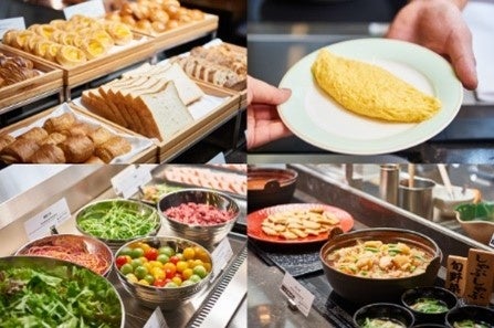 洋食コーナーではシェフたちが鉄板で焼き上げる目玉焼きや、ご注文いただいてから作るオムレツなど出来立ての卵料理をご提供いたします。和食コーナーでは日本を代表するお米の炊きたて御飯、薬味を揃えたお粥や焼き魚、味噌汁や煮物など和食派の皆様にもご満足いただける品揃えです。洋食・和食それぞれの料理をお楽しみください。