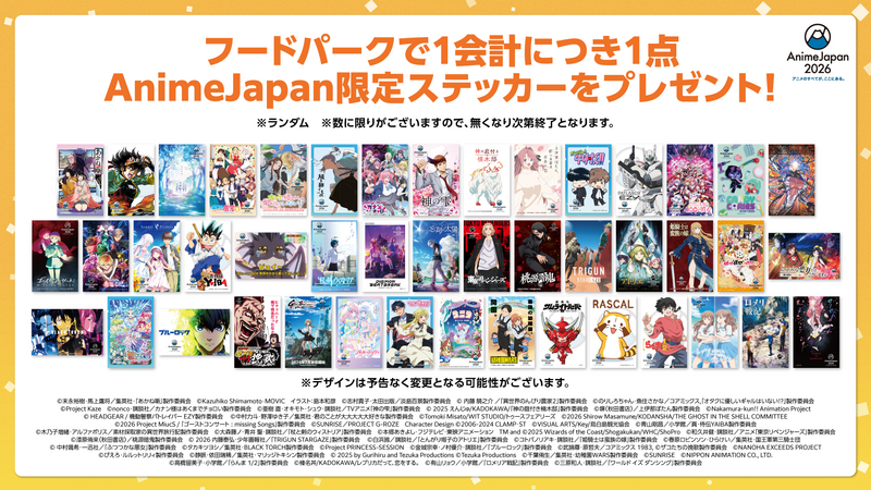 さらに、フードパークでは飲食メニューをご購入いただいた方に、全45種のAnimeJapan限定ステッカーをランダムでプレゼント! どれが当たるかはお楽しみ。そして、過去最大規模の会場を巡る、AJスタンプラリーも開催。 食べて、巡って、集めて、AnimeJapanを1日中味わい尽くそう!
