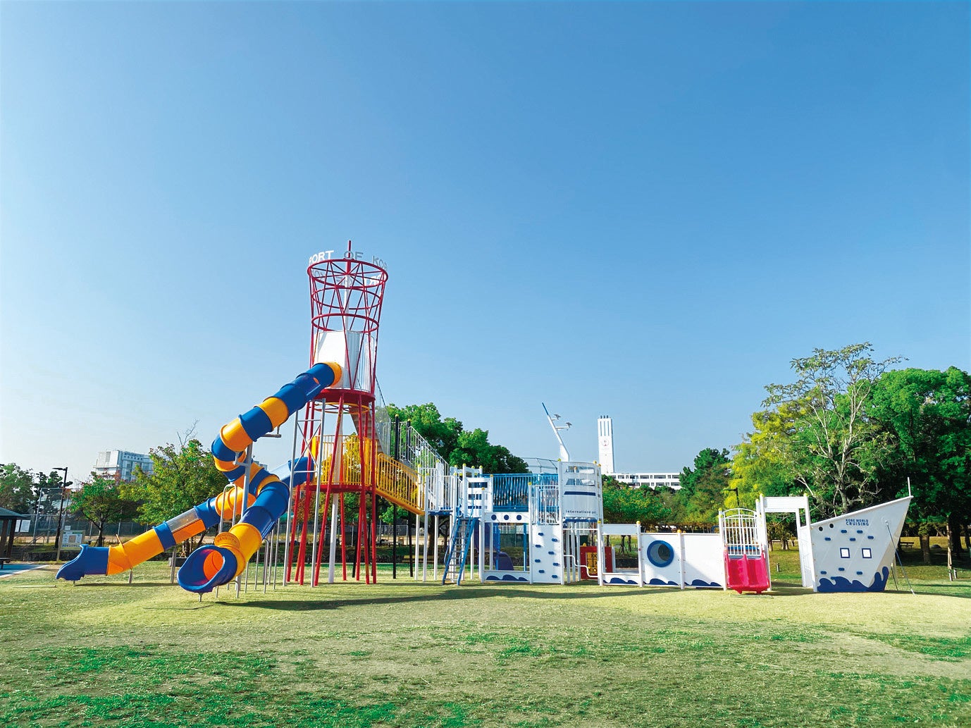 シンボリックな噴水や芝生広場、ポートタワーやクルーズ船をモチーフにした大型遊具もある広々とした公園。小さなお子さまのいるファミリーにおすすめです。
