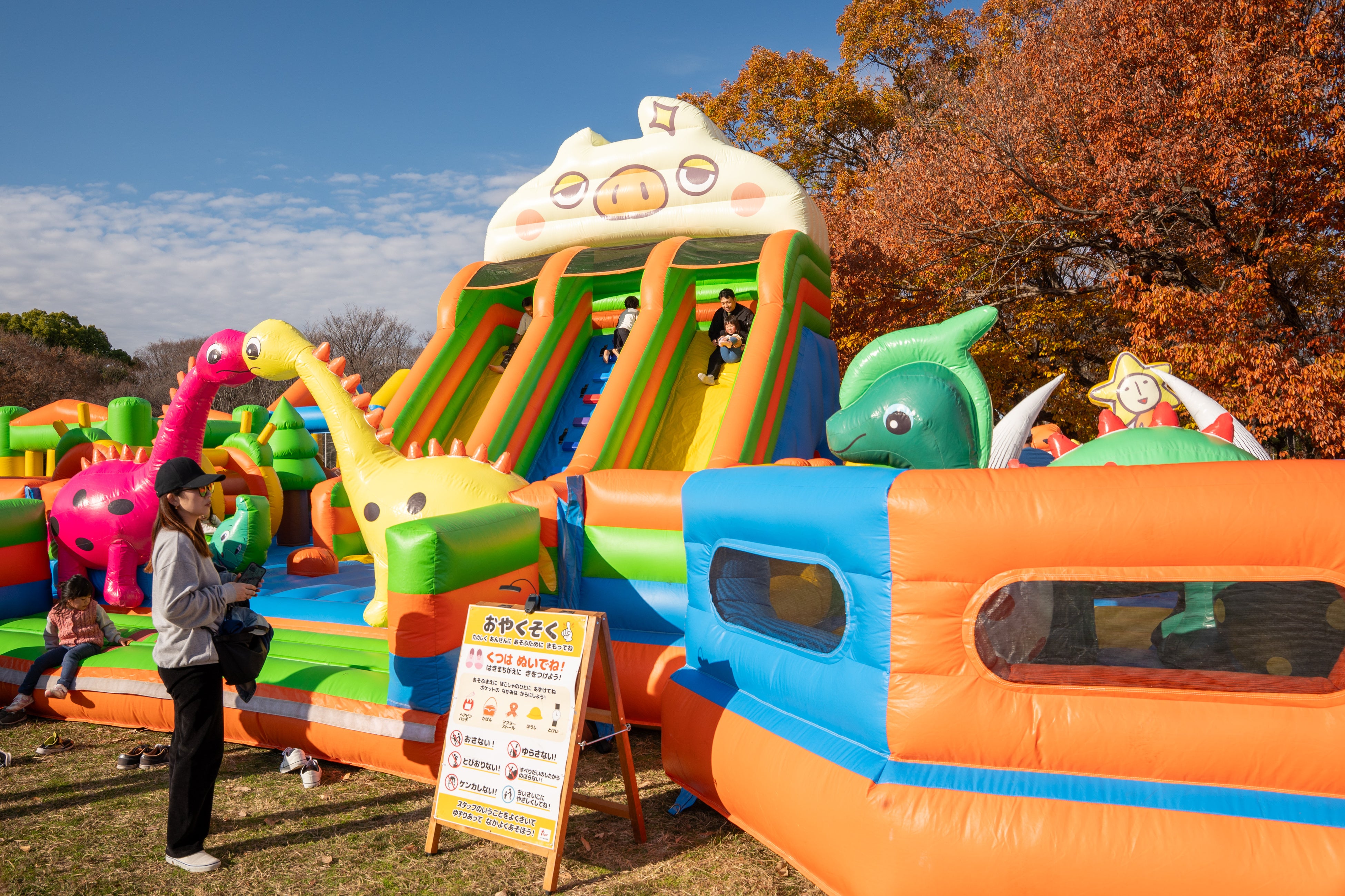 元気いっぱいに遊べる15×10m級の超大型のぽよぽよ遊具は、巨大すべり台やトランポリンなどワクワクする仕掛けがぎっしり詰まった大人気アトラクションです。全身を使ってとんだりはねたり、親子で一緒に体を動かしながら、にぎやかで活気あふれる時間を過ごせます